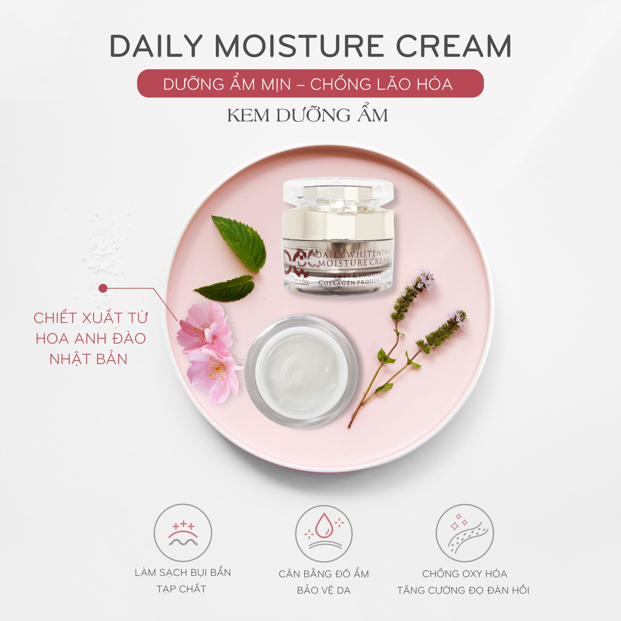 Mua tại TiktokDaily moisture cream Là kem dạng lỏng Công dụng dưỡng trăng, cấp ẩm , duy trì độ đàn hồi cho da, khô, có dấu hiêu lão hóa. Sữ dụng hàng ngày sẽ giúp da tái tạo nhanh da bi khô, nhăn , giúp da căng và min màng. Buổi tối sau khi rữa mặt bôi 1 lớp mỏng đi ngủ
