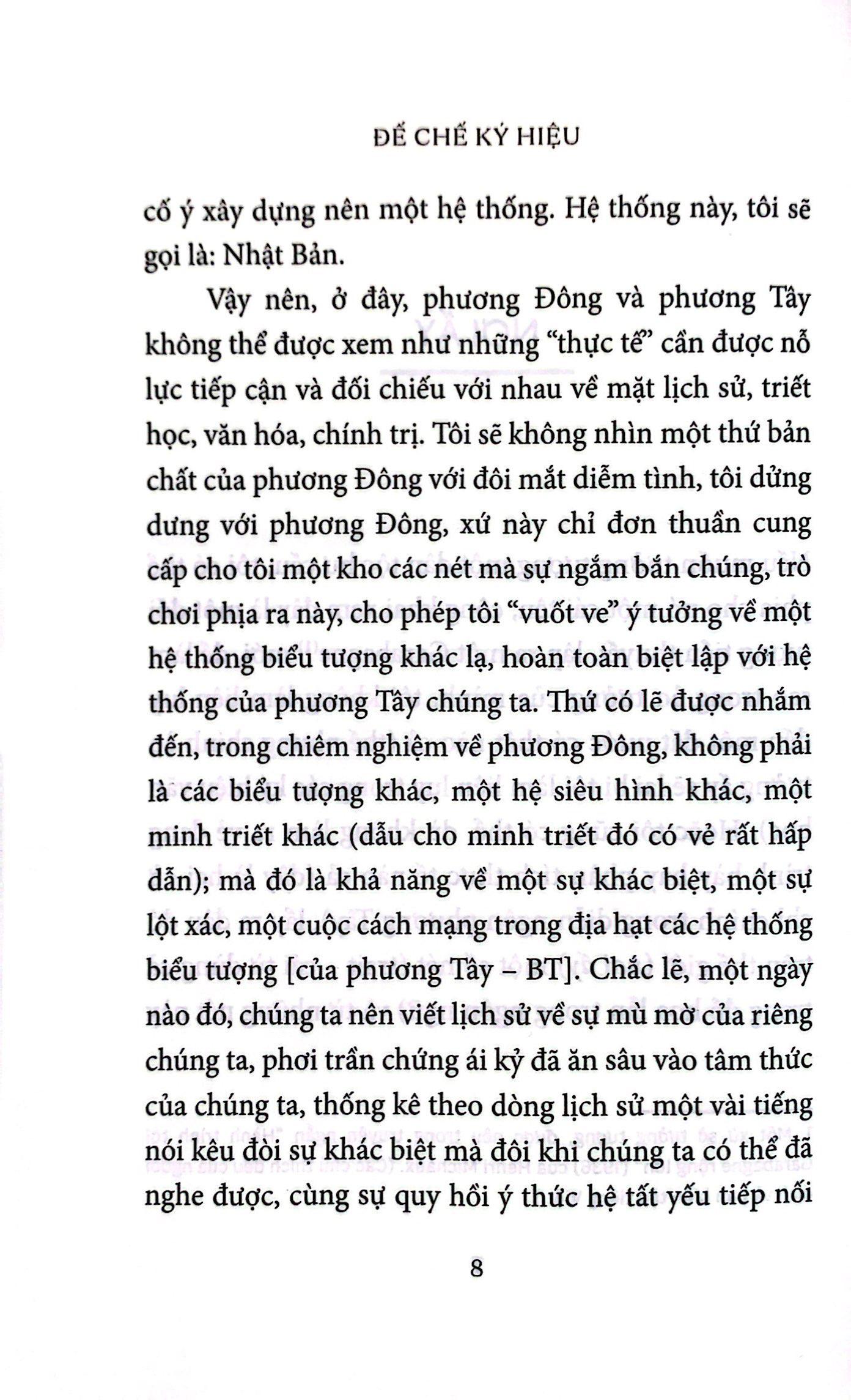 Đế chế ký hiệu không phải là cuốn sách của một trí thức phương Tây có tham vọng tìm hiểu xã hộiv à văn hóa Nhật Bản. Cũng không phải một lời bày tỏ tình yêu dành cho phương Đông. Trên thực tế, đúng hơn là nước Nhật đã đặt Barthes vào tình thế buộc phải viết.