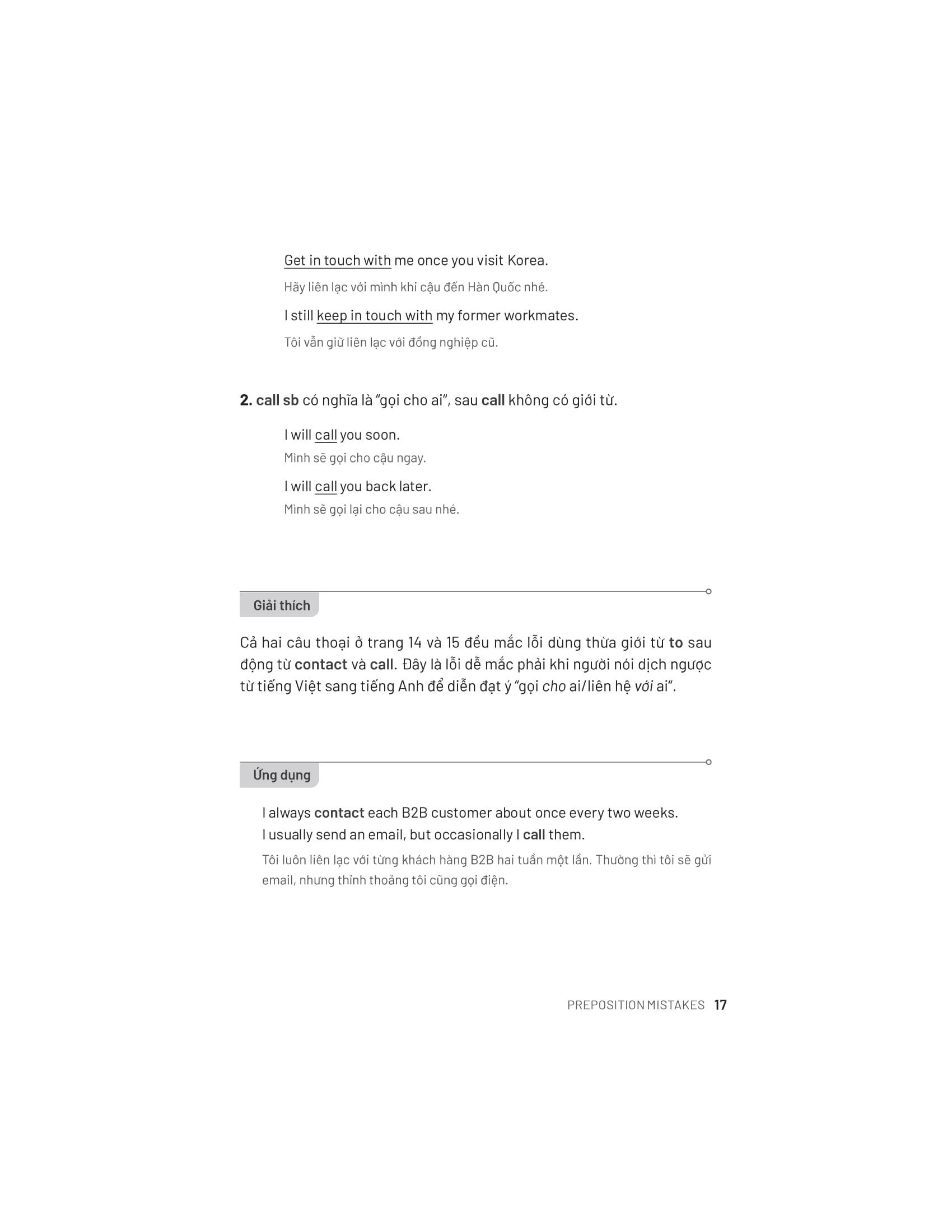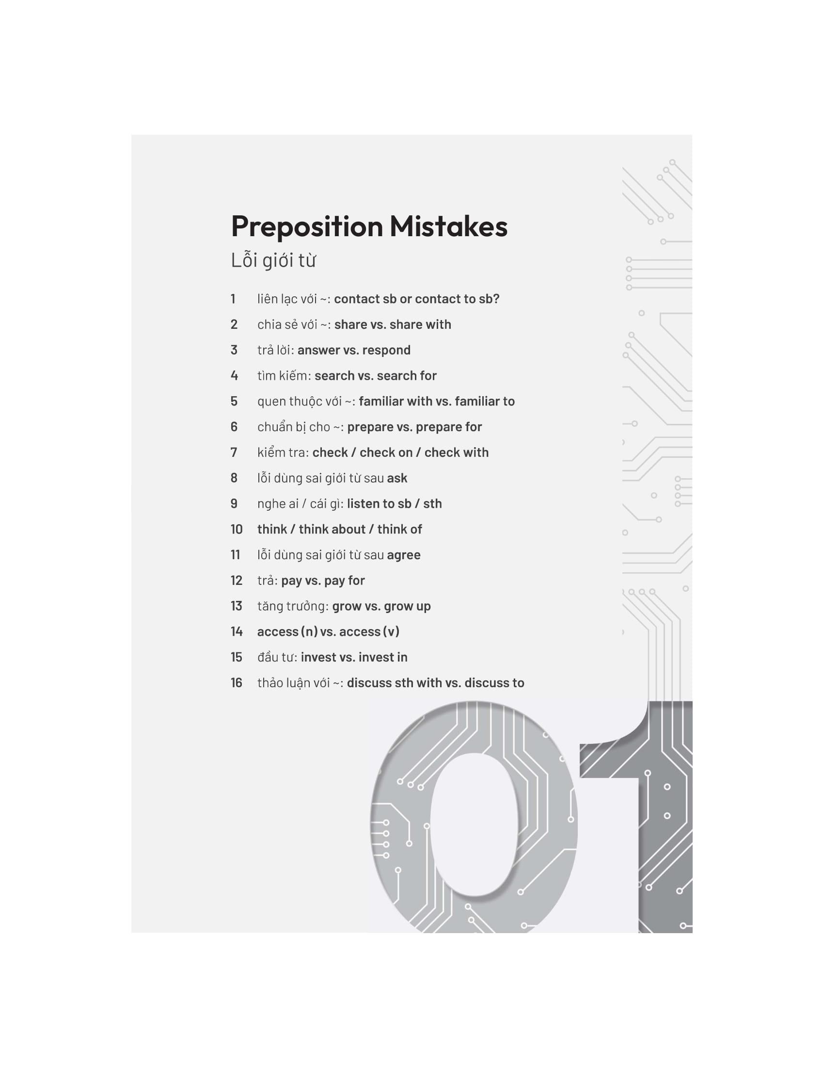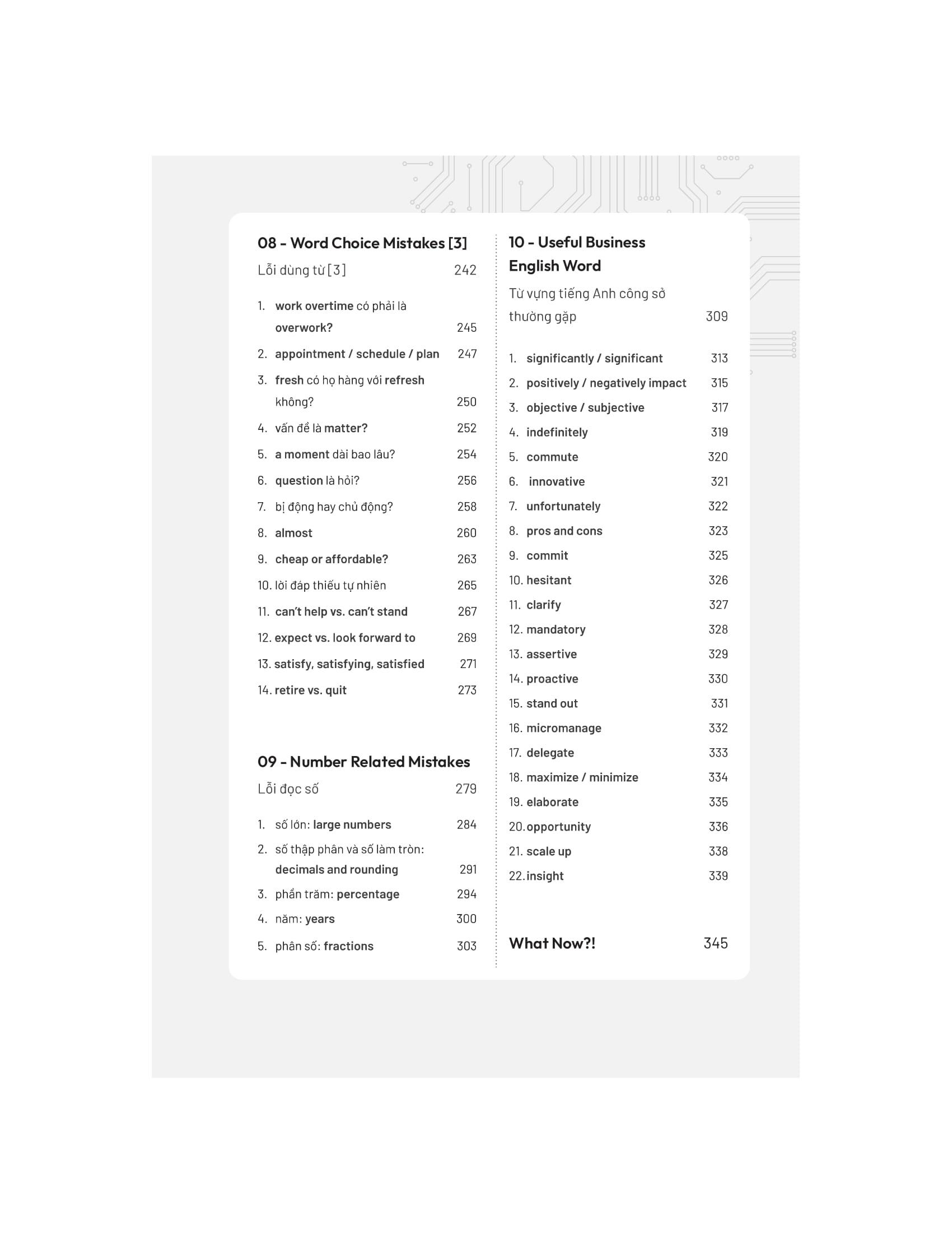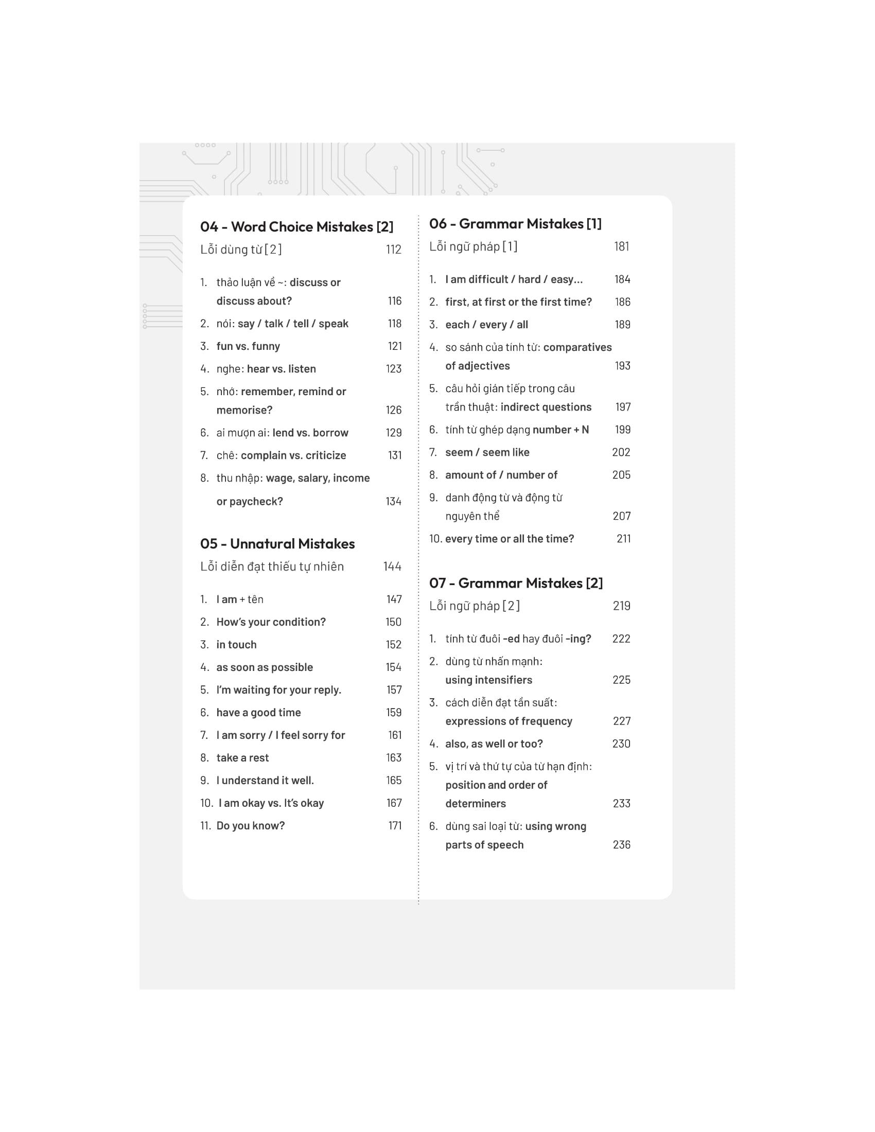 Sách được chia thành 10 chương, trong đó chương 1-9 tập trung vào các nhóm lỗi lớn mà người học tiếng Anh thường mắc phải, và chương 10 đưa ra các từ vựng tiếng Anh công sở phổ biến.