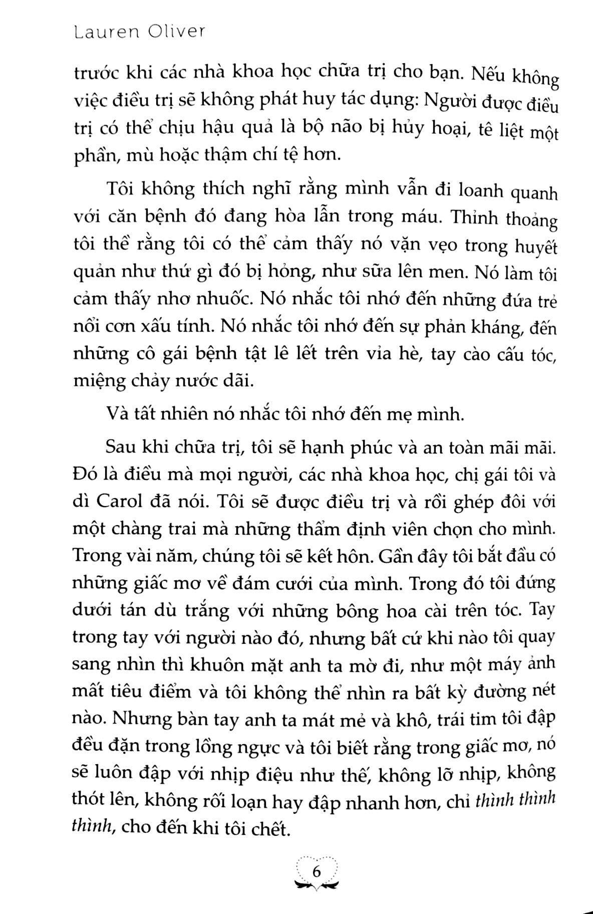 Lena Haloway, nhân vật chính của câu chuyện đang háo hức chờ tới ngày được chữa trị. Hơn ai hết, cô tin tưởng vào sự màu nhiệm của việc miễn nhiễm trước căn bệnh cuồng yêu. Cô sẽ không bao giờ phải khổ sở giống như mẹ cô trước đây. Ít nhất đó là những điều Lena luôn hy vọng cho đến khi cô gặp Alex – chàng trai có mái tóc màu nâu vàng như vương miện từ lá mùa thu và đôi mắt màu hổ phách rực rỡ.