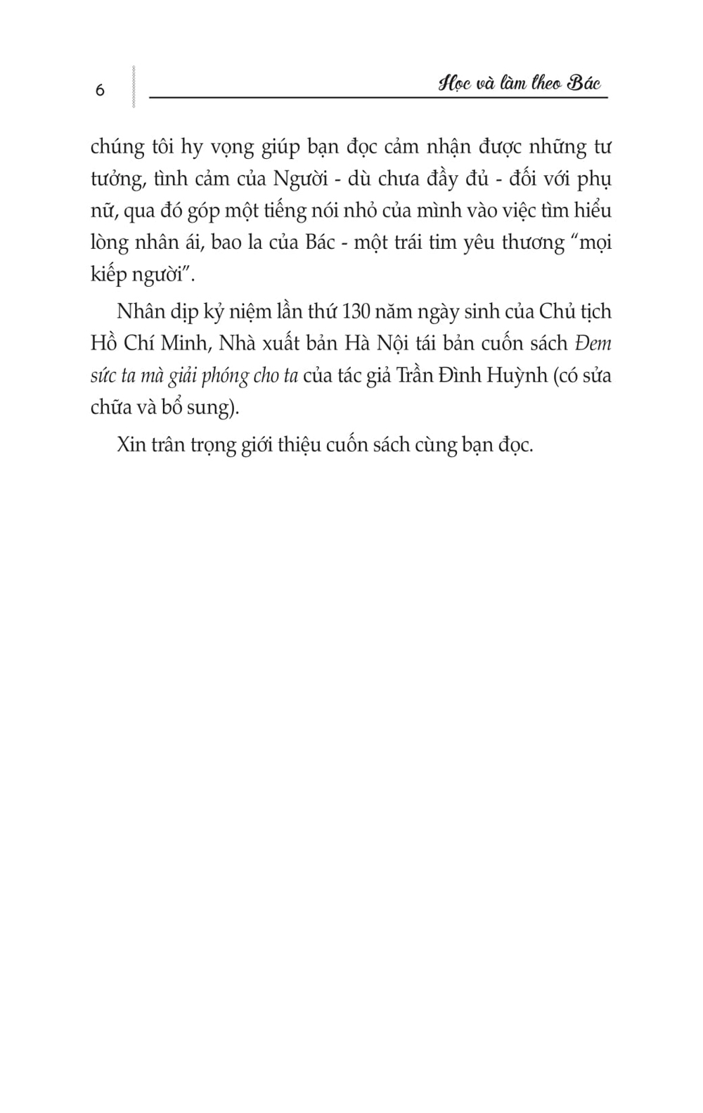 Mua tại TiktokBộ sách “Học và làm theo Bác” gồm 5 quyển, giúp bạn đọc tìm hiểu, nghiên cứu học tập tư tưởng, đạo đức và tác phong Hồ Chí Minh. Đem sức ta mà giải phóng cho ta giúp chúng ta cảm nhận được những tư tưởng, tình cảm của Người đối với phụ nữ - Phụ nữ là một lực lượng hết sức quan trọng góp phần tạo nên động lực mạnh mẽ của toàn xã hội và là mục tiêu của sự nghiệp công nghiệp hóa, hiện đại hóa đất nước. Qua đó góp tiếng nói vào việc tìm hiểu lòng nhân ái, bao la của Bác – một trái tim yêu thương “mọi kiếp người”.