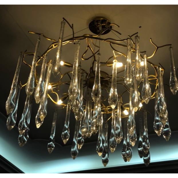 Chất liệu: đế là kim khí mạ vang,thân đèn là kim loại tổng hợp nhôm mạ vang phối hợp với những thanh phale hình giọt nước chuẩn K9