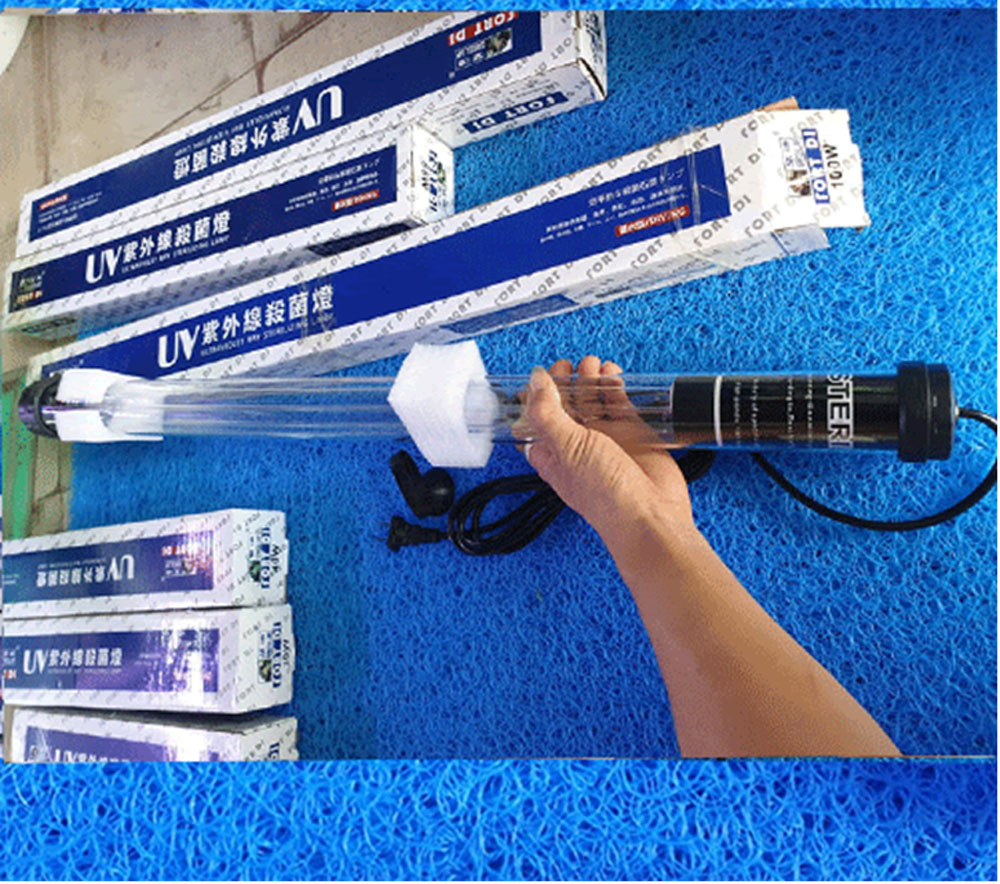 - Sử dụng tia UVC, ống thủy tinh thạch cao truyền tải tia cực tím tốt. Công dụng: Diệt rêu, nấm, diệt khuẩn bể cá, hồ cá cảnh, hồ koi ngăn tảo sinh trưởng. Cách dùng: Đặt đèn ngập toàn bộ trong nước ở trong bể lọc, có thể là ngăn máy bơm, tốt nên đặt nằm ngang sao cho ánh sáng tác dụng lên nước là tối đa. Khi hồ đang bùng phát tảo, nên BẬT 24/24H cho tới khi hết sạch tảo. Khi chất lượng nước hồ ổn định, nên bật từ 2 – 4 tiếng/ngày tùy theo mức độ nắng và mái che hồ. Lưu ý: CHE CHẮN SÁNG SÁNG TỪ ĐÈN, KO ĐỂ ĐÈN TIẾP XÚC MẮT TRỰC TIẾP