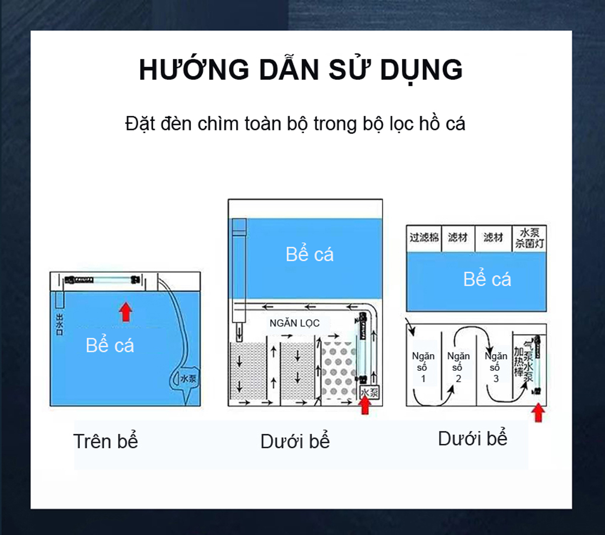 - Đặt đèn ngập toàn bộ trong nước, tốt nhất nên đặt nằm ngang sao cho ánh sáng tác dụng lên nước là tối đa.