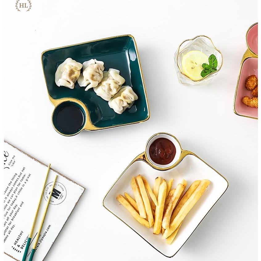 ✨Đĩa Vuông Viền Vàng Có Ngăn Chấm | Đĩa sứ vuông viền vàng cao cấp 2022 có chia ngăn đựng gia vị Phong Cách Decor Vintage