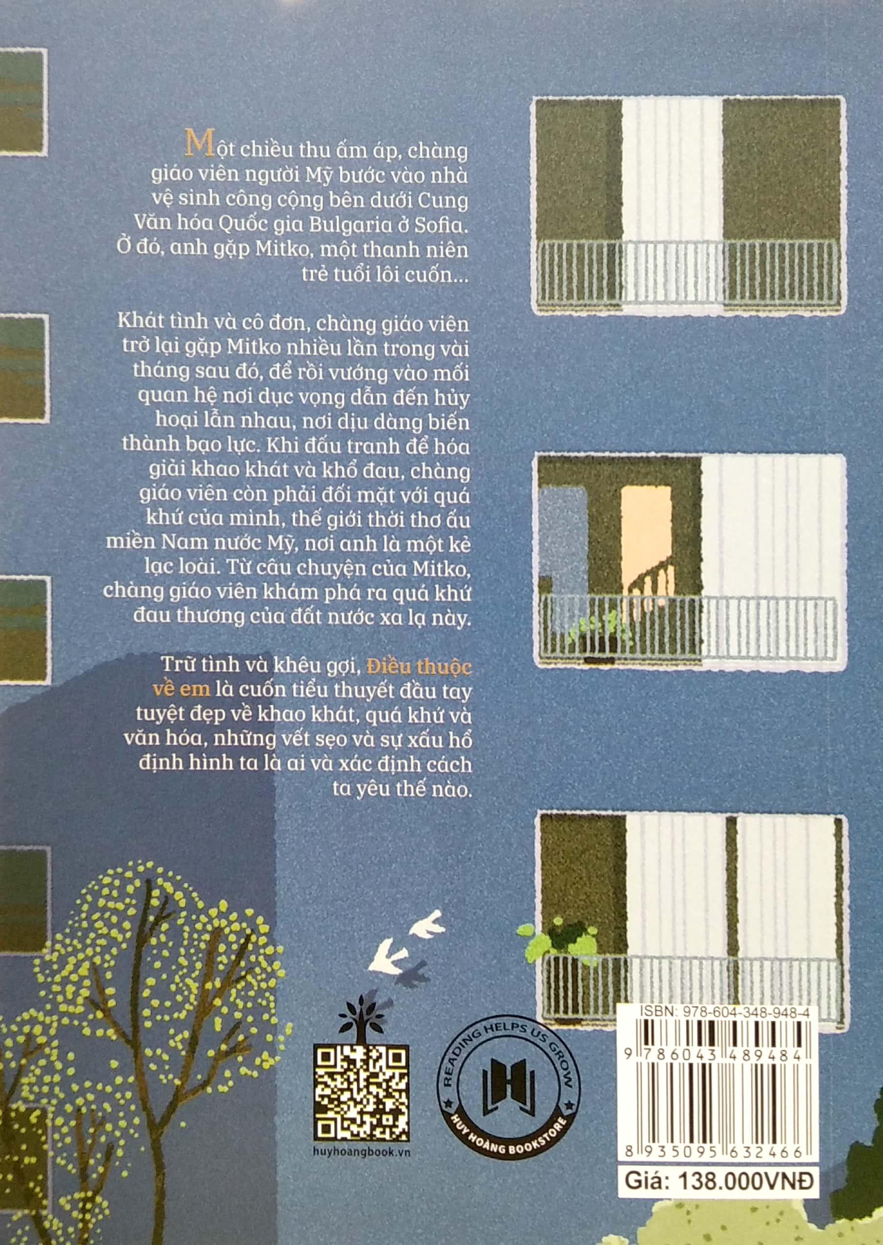 “Tinh tế… Về phong cách, Greenwell ảnh hưởng từ Sebald nhiều hơn Nabokov… Một trong những nét đẹp lớn trong văn Greenwell là văn anh cực kỳ sâu sắc, ngay cả khi chạm đến nhu cầu và đam mê xác thịt. Đây là cảm xúc được hồi tưởng trong yên tĩnh, hay đúng hơn là trong u sầu.” – Damon Galgut, The Nation. Một chiều thu ấm áp, chàng giáo viên người Mỹ bước vào nhà vệ sinh công cộng bên dưới Cung Văn hóa Quốc gia Bulgaria ở Sofia. Ở đó, anh gặp Mitko, một thanh niên trẻ lôi cuốn… Khát tình và cô đơn, chàng giáo viên trở lại gặp Mitko nhiều lần trong vài tháng sau đó, để rồi vướng vào mối quan hệ nơi dục vọng dẫn đến hủy hoại lẫn nhau, nơi dịu dàng biến thành bạo lực. Khi đấu tranh để hóa giải khao khát và khổ đau, chàng giáo viên còn phải đối mặt với quá khứ của mình, thế giới thời thơ ấu miền Nam nước Mỹ, nơi anh là một kẻ lạc loài. Từ câu chuyện của Mitko, chàng giáo viên khám phá ra quá khứ đau thương của đất nước xa lạ này. Trữ tình và khêu gợi, ĐIỀU THUỘC VỀ EM là cuốn tiểu thuyết đầu tay tuyệt đẹp về khao khát, quá khứ và văn hóa, những vết sẹo và sự xấu hổ định hình ta là ai và xác định cách ta yêu thế nào.