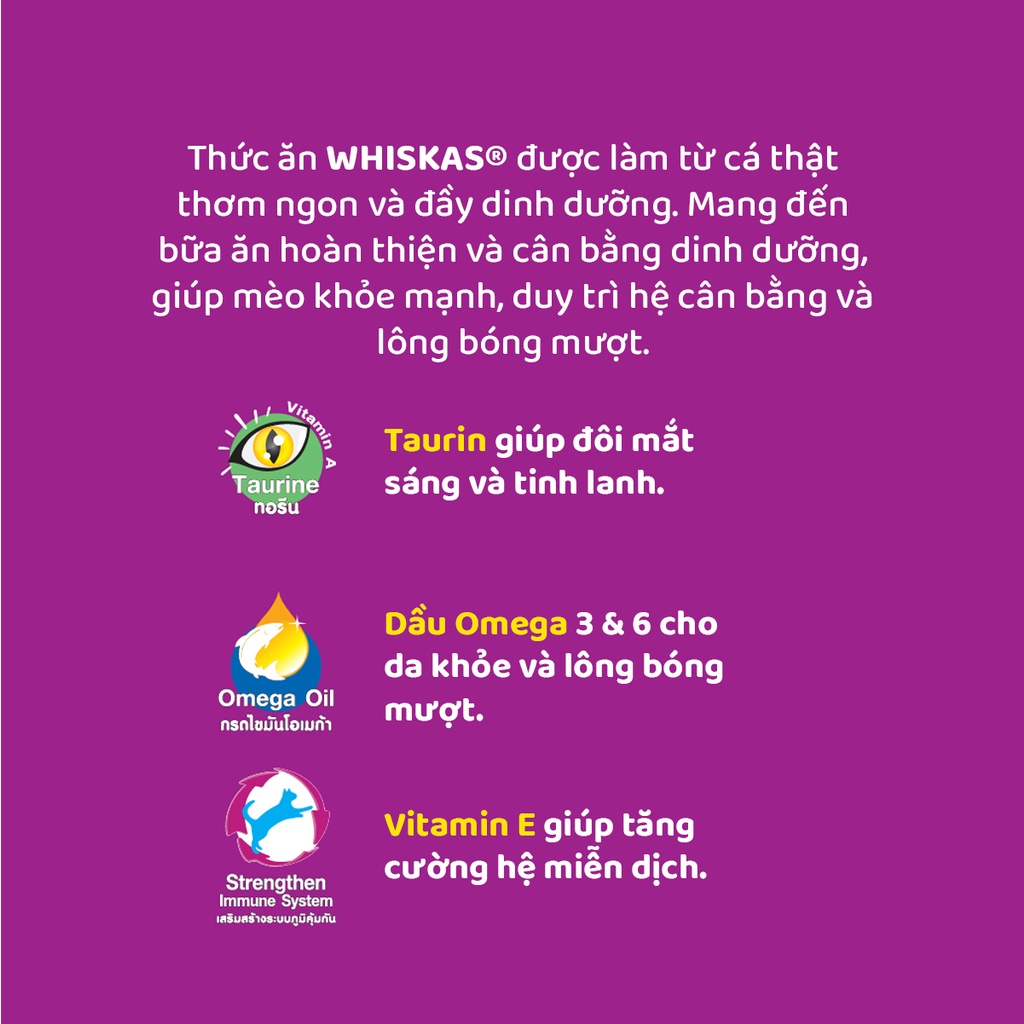Đồ Ăn khô Whiskas dành cho mèo được phát triển bởi các chất dinh dưỡng tối ưu và được các chuyên gia vật nuôi trên khắp thế giới công nhận là sản phẩm dinh dưỡng tốt nhất và khuyên dùng.
