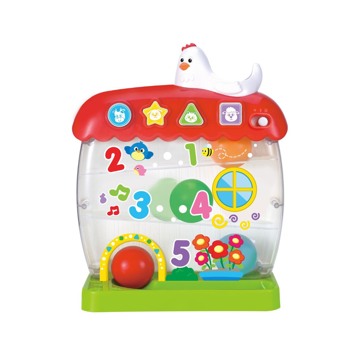 Thiết kế sinh động và hấp dẫn: Mô hình ngôi nhà với các quả bóng lăn qua tạo ra âm thanh vui nhộn, thu hút sự chú ý và khuyến khích bé khám phá.