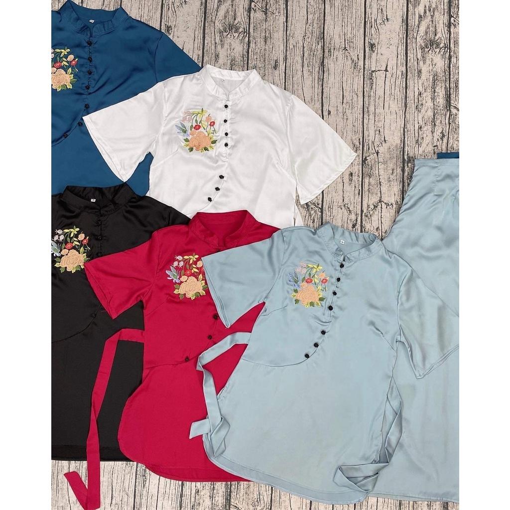 Đồ lam đi chùa lụa gấm - bộ quần áo Phật tử lụa vân hoa cỏ xinh xắn - pháp phục nữ cổ tàu cài chéo