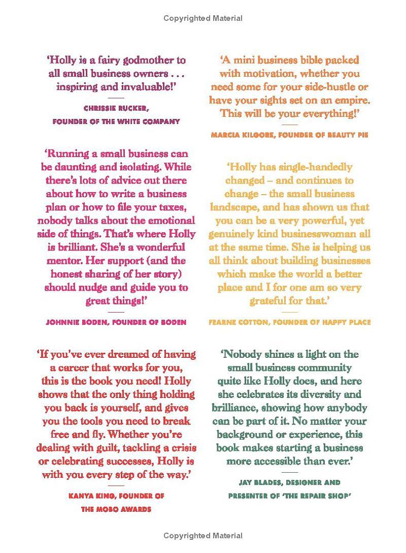 Demystifying the grey world of business, whether you've yet to take your first steps, or find yourself stuck in a rut, this beautiful and vibrant book will allow your dreams to take flight. Holly shares her own story – along with those of acclaimed founders like Sir Richard Branson and Jo Malone CBE – revealing their biggest lessons and proven advice on creating and growing a business. From side hustle to full-time, from defeating your confidence gremlins to creating an empowered community, Holly reveals both the skills and the mindset any founder needs to help their business thrive.