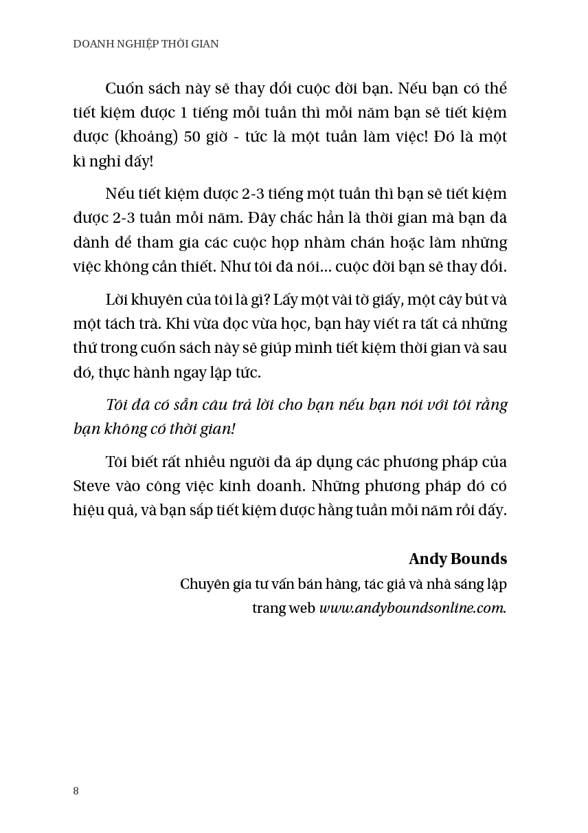 Cuốn sách này sẽ thay đổi cuộc đời bạn. Nếu bạn có thể tiết kiệm được 1 tiếng mỗi tuần thì mỗi năm bạn sẽ tiết kiệm được khoảng 50 giờ - tức là một tuần làm việc! Còn nếu tiết kiệm được 2-3 tiếng một tuần thì bạn sẽ tiết kiệm được 2-3 tuần mỗi năm. Đây chắc hẳn là thời gian mà bạn đã dành để tham gia các cuộc họp nhàm chán hoặc làm những việc không cần thiết.