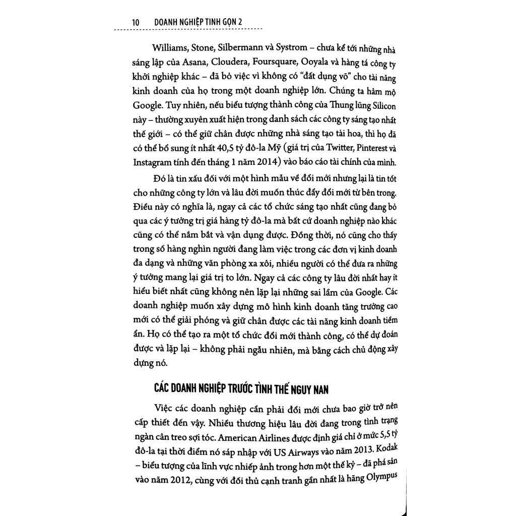Doanh nghiệp tinh gọn 2 trình bày một thiết kế đột phá nhằm cách mạng hóa các tổ chức lớn, dựa trên các nguyên lý và thực tiễn được cộng đồng khởi nghiệp tán thành, đồng thời giải thích cách để tạo ra một loạt các ý tưởng về sản phẩm hoặc dịch vụ và tìm ra yếu tố quyết định giúp công việc kinh doanh có triển vọng và ổn định trên quy mô của một công ty lớn. Cuốn sách cung cấp cho bạn:
