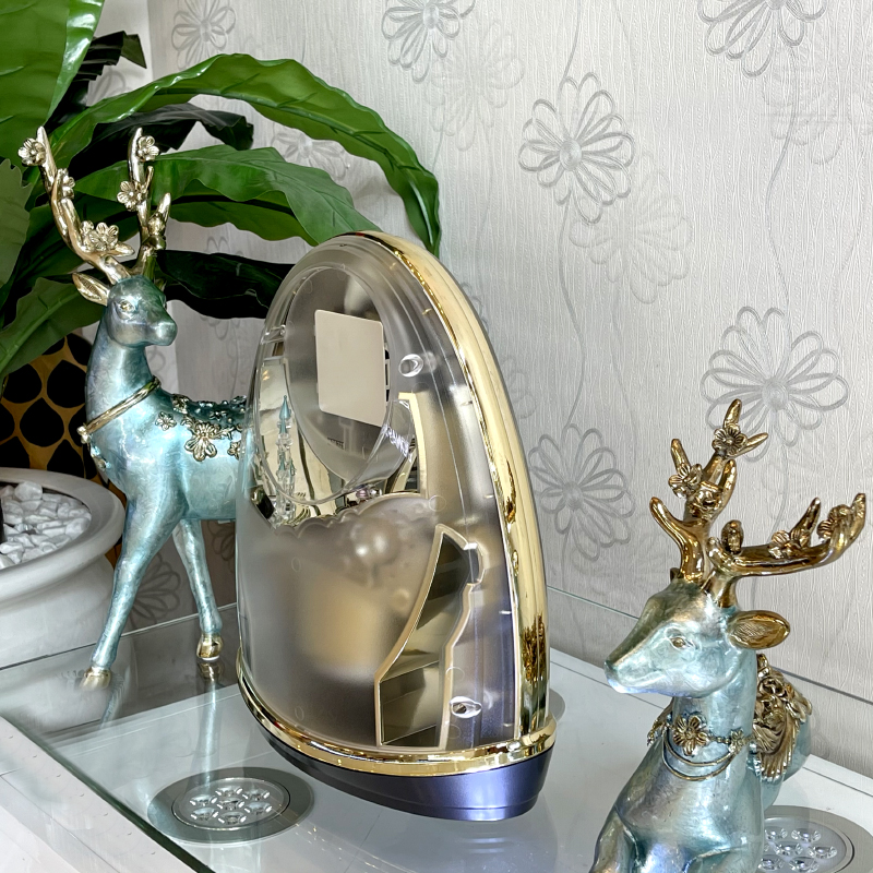 Đồng hồ để bàn Nhật Bản Rhythm 4RP796WS18, dùng pin (AAx2), vỏ nhựa cao cấp mạ vàng kết hợp mica trong suốt nhìn xuyên thấu, Kích thước 14.0 x 22.8 x 8.3cm, trọng lượng 390g. Quả