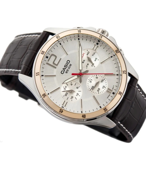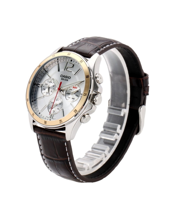 Đồng hồ Casio MTP-1374L-7AVDF dành cho nam với dây da cao cấp cùng mặt đồng hồ nền trắng viền vàng.