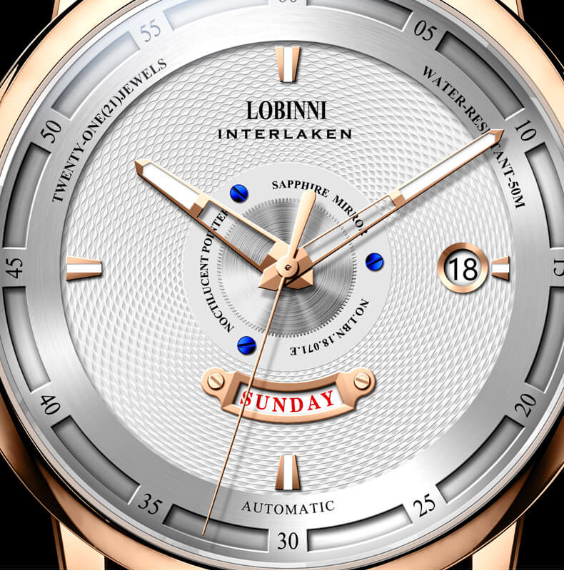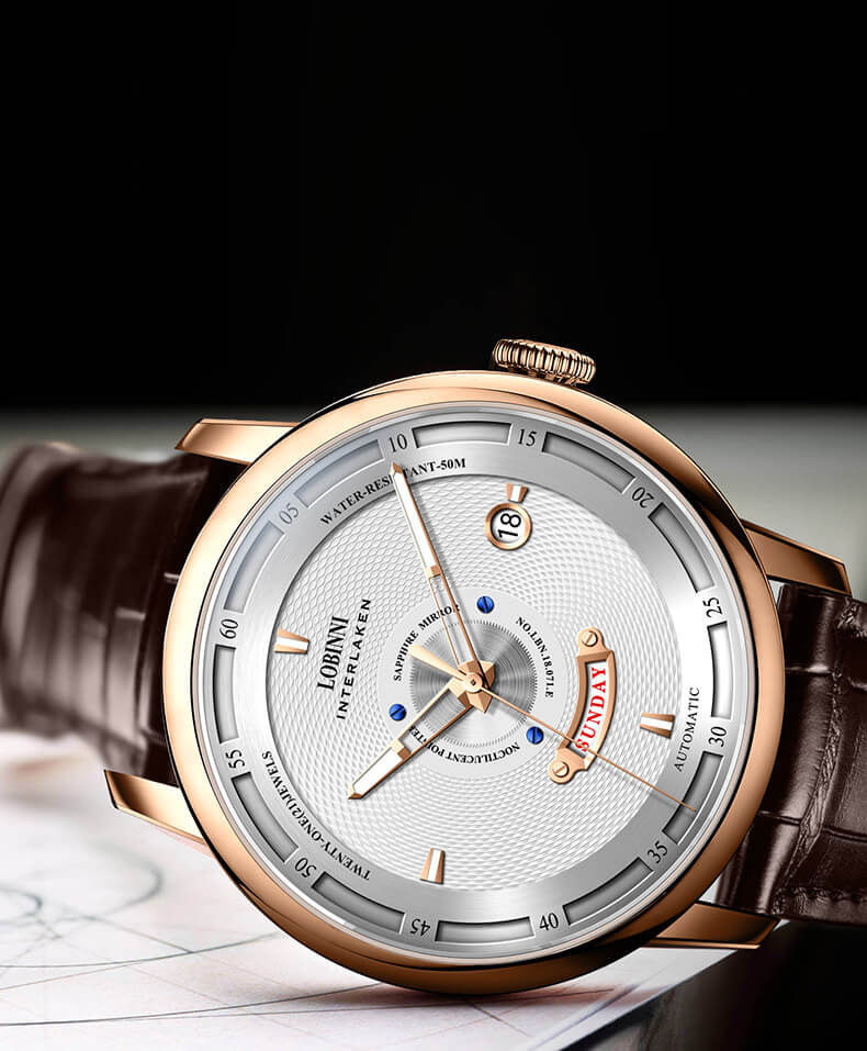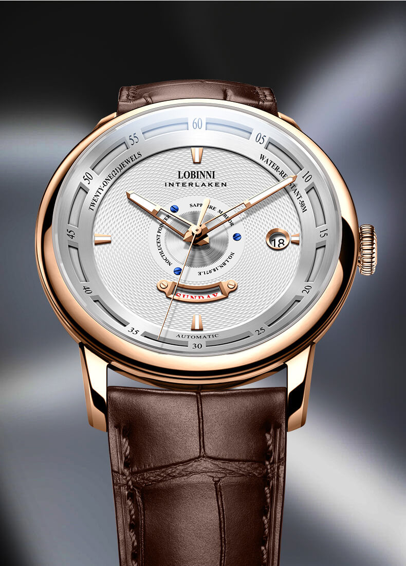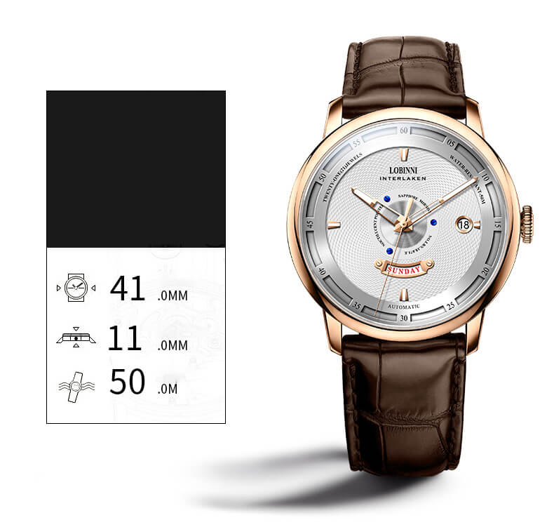 Nhãn hiệu LOBINNI Mã sản phẩm No.9010-1 Giới tính Nam Kiểu máy Automatic (Máy Cơ) Đường kính mặt 42 mm Độ dày 11 mm Chất liệu vỏ Thép không gỉ 316L Chất liệu dây Dây da cao cấp Chất liệu mặt kính Sapphire Khả