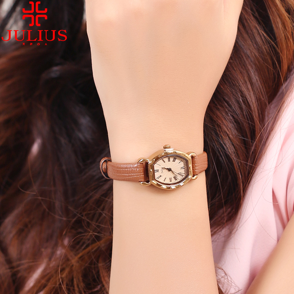 - Đồng Hồ Nữ Dây Da Julius JA - 496 (24mm) - Dây Nâu Viền Đồng có thiết kế mặt đeo trẻ trung, xinh xắn cùng tông màu nâu cá tính của dây đeo và khung