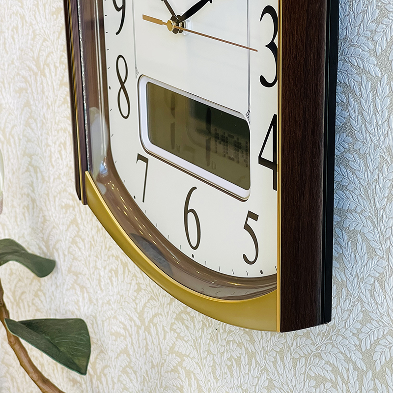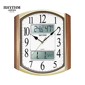 Đồng hồ treo tường Rhythm CFG724NR06, dùng pin (AAx2), vỏ nhựa màu nâu kim loại. Kích thước 36.0 x 4.5cm, trọng lượng 1,24Kg. 2 Màn hình hiện thị lịch ngày thứ tháng,nhiệt độ và độ