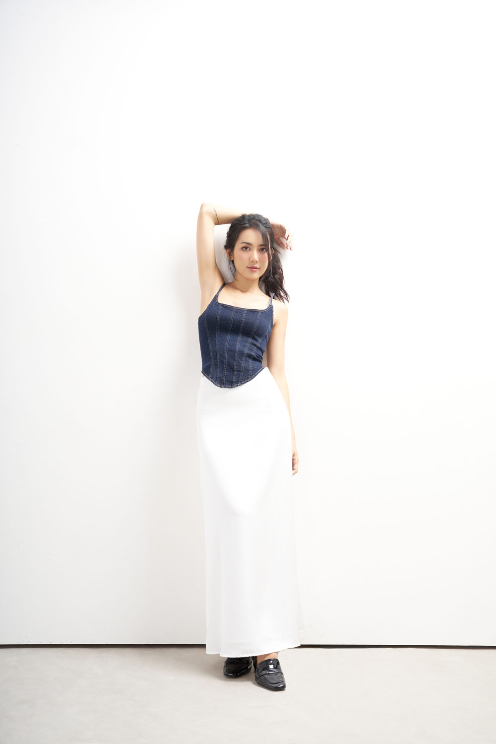 1.Mô tả INFINITY / TAYLOR Chân váy đuôi cá, dài qua bắp chân, xẻ trước. 2.Thông tin chi tiết Dòng hàng: Chân váy Chất liệu: Khaki elastic Màu sắc: Trắng Model: 1m73, 50kg, 81-64-93 LƯU