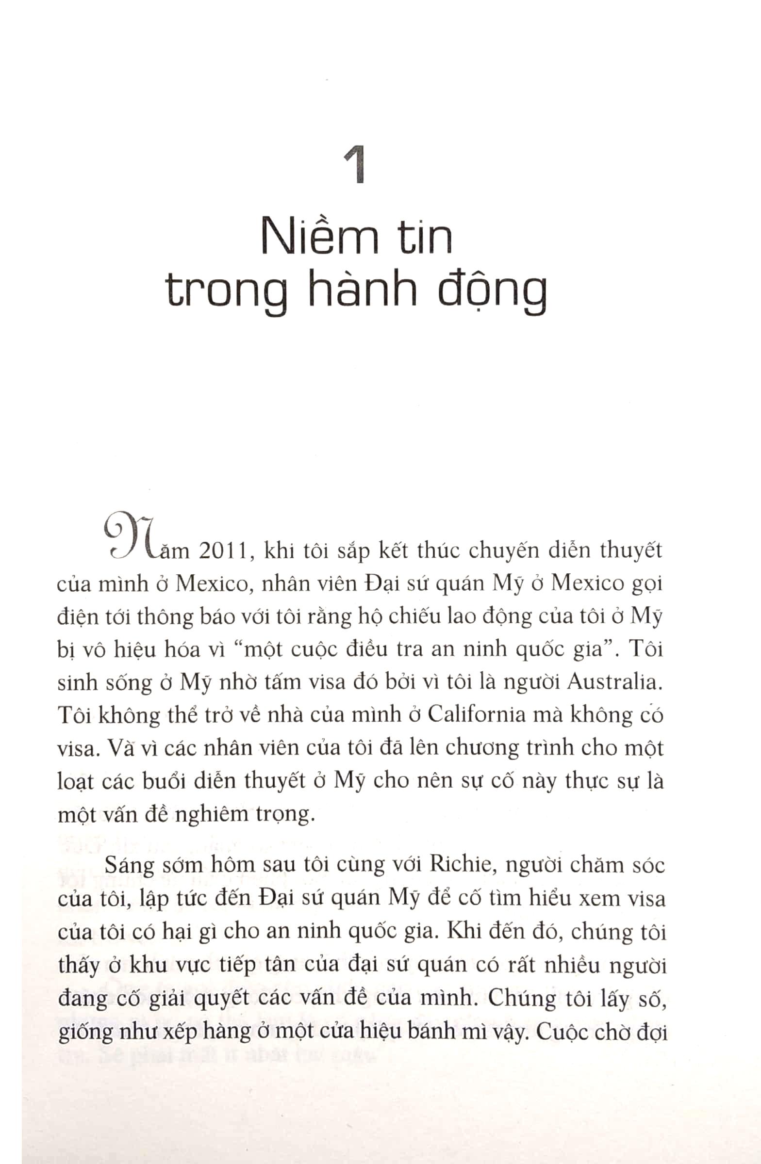 Tôi viết cuốn sách này với mục đích chia sẻ với các bạn sức mạnh không gì ngăn cản được của niềm tin trong hành động, nguồn sức mạnh đã giúp tôi tạo lập một cuộc sống tốt đẹp đến mức diệu kỳ, bất chấp những khuyết tật nặng nề. Đặt niềm tin vào hành động có nghĩa là tin tưởng và đạt được thành quả. Đó là niềm tin vào bản thân bạn, tài năng của bạn, mục đích của bạn, và quan trọng hơn hết, là niềm tin vào tình yêu của Đấng Sáng Tạo và những kế hoạch quan trọng mà Người dành cho cuộc đời bạn.