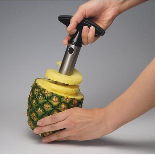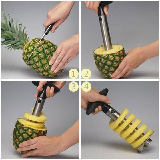 Với dụng cụ gọt thơm tiện dụng này: trước tiên bạn phải cắt phần đầu quả thơm, rồi đặt dụng cụ vào giữa quả thơm và đẩy xuống. Chỉ sau 30 giây bạn sẽ có ngay những miếng thơm thật hấp dẫn và đẹp mắt. Thật tiện lợi và nhanh chóng phải không nào, giờ đây cắt gọt thơm không còn quá vất vả với chị em nôi trợ nữa.