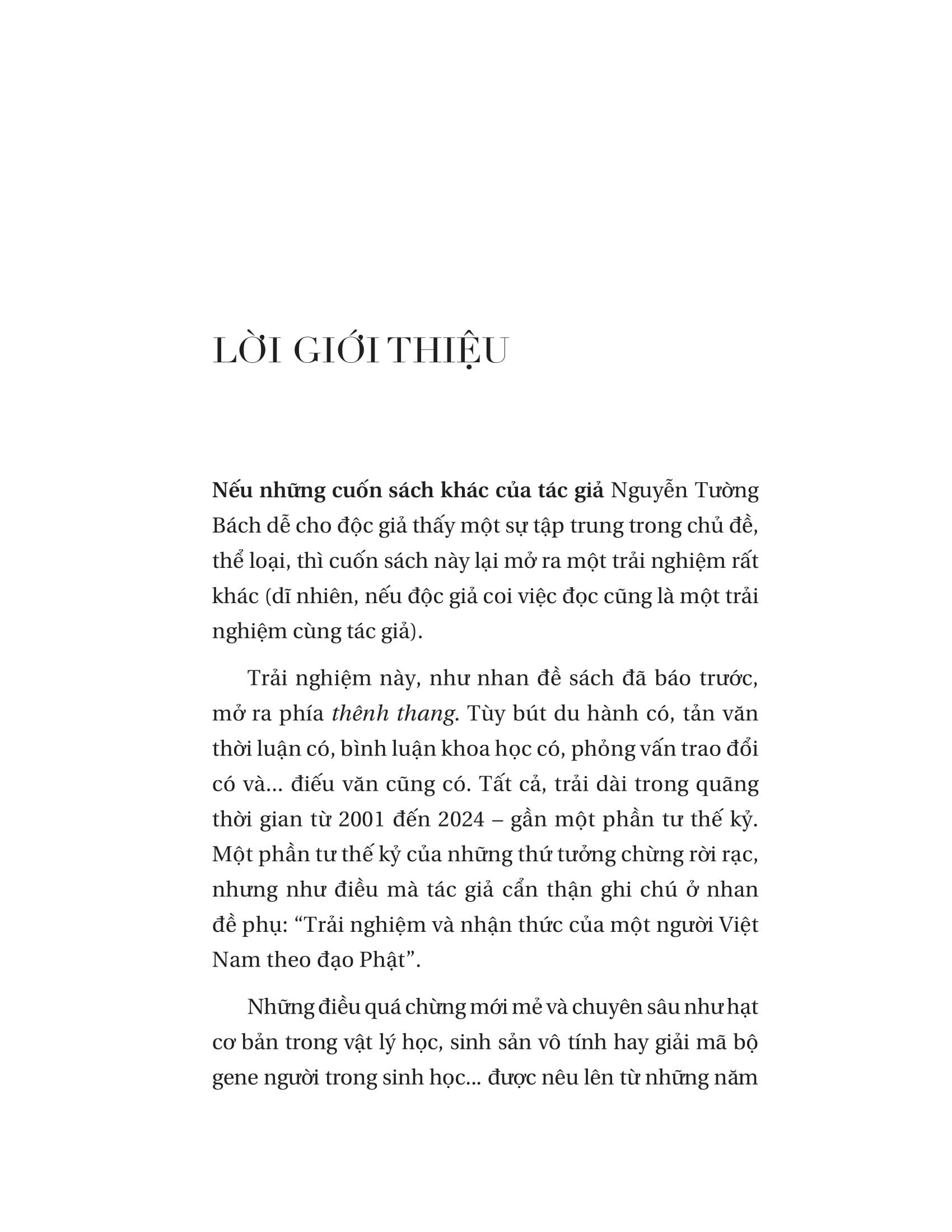 Trải nghiệm này, như nhan đề sách đã báo trước, mở ra phía thênh thang. Tùy bút du hành có, tản văn thời luận có, bình luận khoa học có, phỏng vấn trao đổi có và... điếu văn cũng có. Tất cả, trải dài trong quãng thời gian từ 2001 đến 2024 - gần một phần tư thế kỷ. Một phần tư thế kỷ của những thứ tưởng chừng rời rạc, nhưng như điều mà tác giả cẩn thận ghi chú ở nhan đề phụ: “Trải nghiệm và Nhận thức của một người Việt Nam theo đạo Phật”.