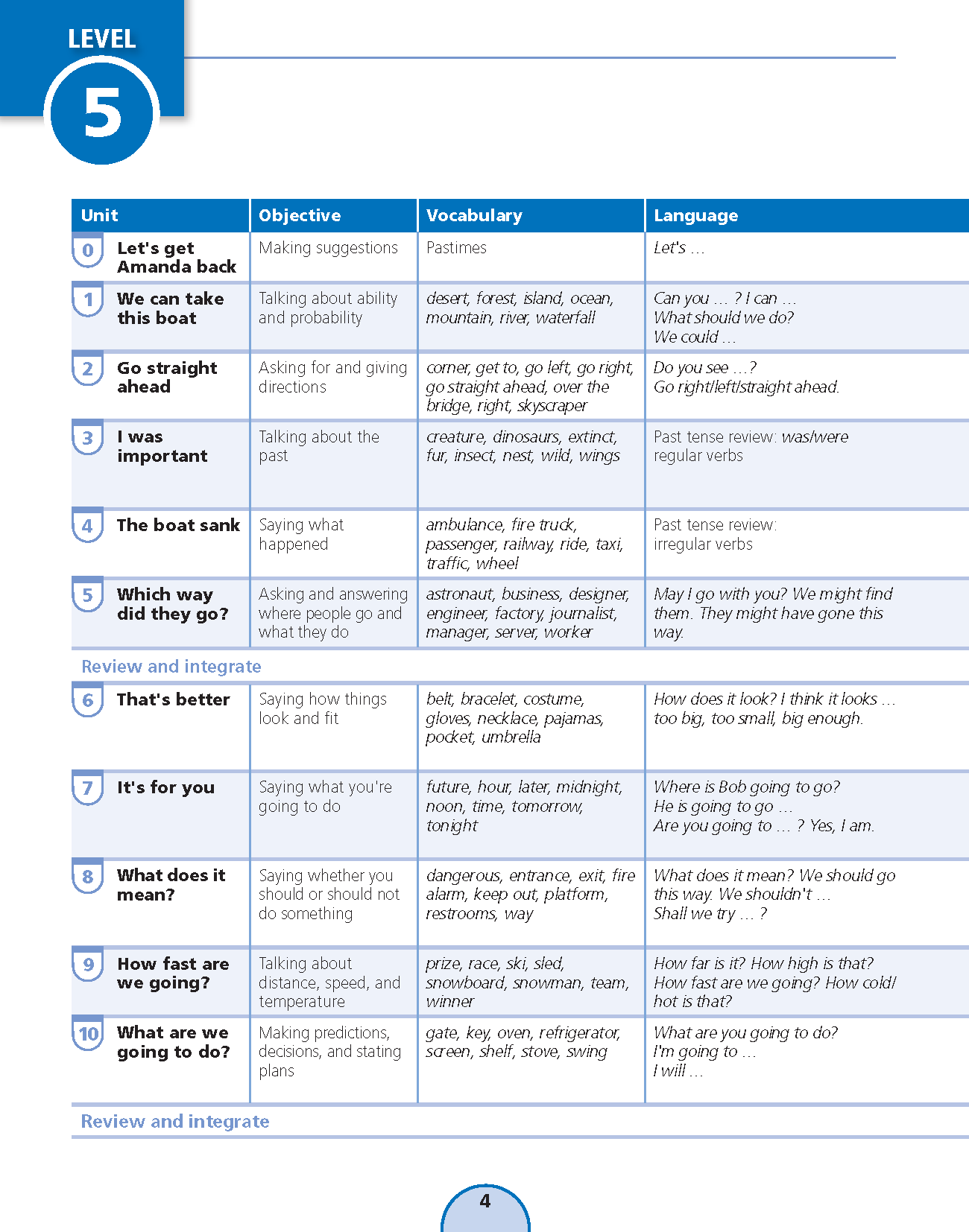 Sách: Learning English 4 - Dành Cho Học Sinh Lớp 4 NỘI DUNG VÀ CẤU TRÚC CỦA QUYỂN SÁCH : Bảng mục lục: Chỉ rõ các mục tiêu chính và trọng tâm của mỗi bài