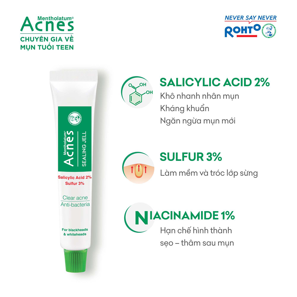 Mua tại TiktokGel ngừa mụn kháng khuẩn Acnes Sealing Jell 18g Gel chấm mụn đầu trắng và đầu đen Acnes Sealing Jell là gel chấm mụn đến từ thương hiệu Acnes, được tập đoàn Rohto-Mentholatum nghiên cứu và phát triển phù hợp cho mụn đầu trắng và mụn đầu đen. Công thức kết hợp các hoạt chất Salicylic Acid, Sulfur và Niacinamide, hiệu quả trong việc làm khô nhân mụn, giúp nhân mụn thoát ra dễ dàng, hỗ trợ phục hồi vùng da mụn, ngăn ngừa hình thành mụn mới và hạn chế hình thành sẹo - thâm sau mụn.