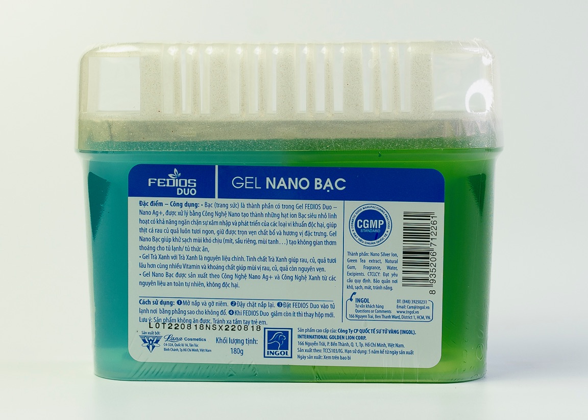 - Gel FEDIOS-Duo khử mùi tủ lạnh có loạị:: Gel Trà Xanh:: Tinh chất Trà Xanh sẽ giúp cho thực phẩm trong tủ lạnh được tươi xanh lâu hơn, điều này giúp cho các vitamin, các khoáng chất vi lượng, mùi vị trong thực phẩm còn nguyên vẹn. Giúp thực phẩm giữ được hương vị thơm ngon tự nhiên. Gel Than Tre:: Với tinh chất Than Tre Xanh thiên nhiên, Gel Than Tre FEDIOS-Duo giúp khử sạch mùi khó chịu làm cho tủ lạnh/tủ thức ăn luôn luôn tinh thơm, sạch thuần khiết. Điều này vừa giúp thức ăn trong tủ giữ đúng vị ngon vốn có, vừa không bị lẫn lộn các loại mùi khó chịu, vừa giúp bảo vệ sức khỏe cả nhà. Gel Nano Bạc:: Trong Gel FEDIOS Duo – Nano Ag+, được xử lý bằng Công Nghệ Nano tạo thành những hạt ion Bạc siêu nhỏ linh hoạt có khả năng ngănchặn sự xâm nhập và phát triển của các loại vi khuẩn độc hại, giúp thịt cá rauquả luôn tươi ngon, giữ được trọn vẹn chất bổ và hương vị đặc trưng. Gel Nano Bạc giúp khử mùi khó chịu (mít, sầu riêng, mùi tanh…) tạo không gian thơm thoáng cho tủ lạnh/tủ thức ăn.