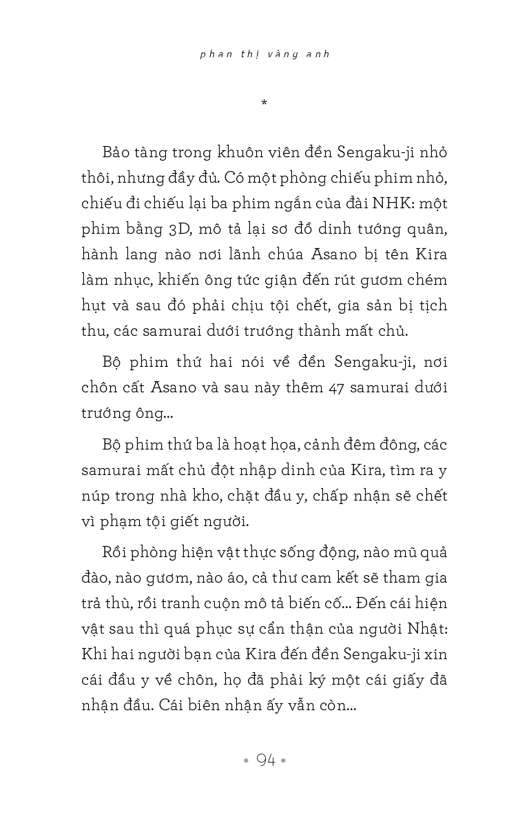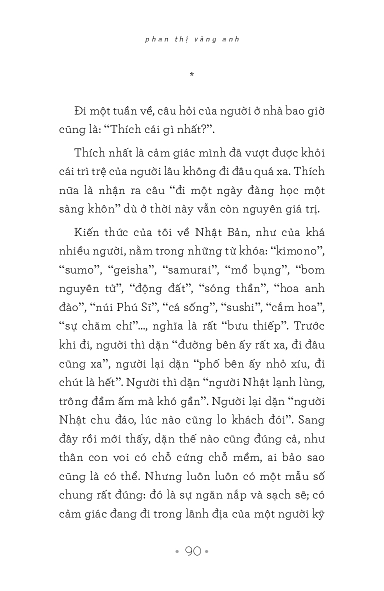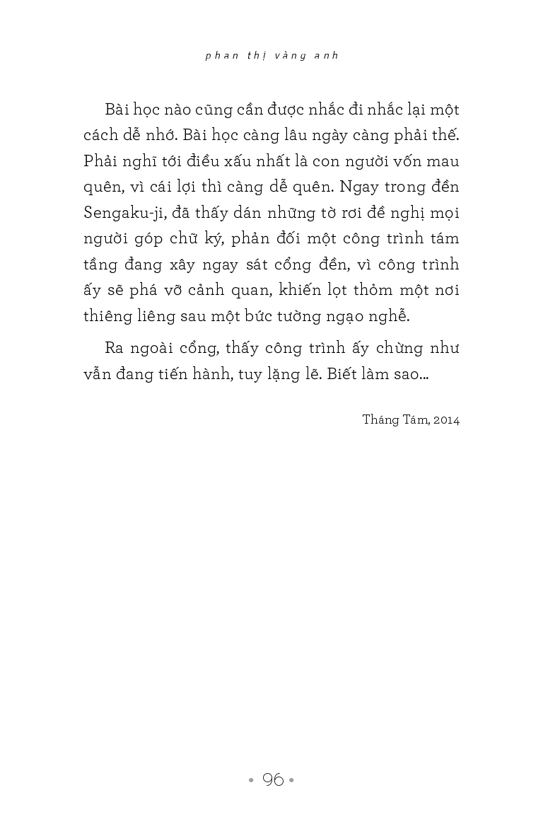 …Khi đã lùi xa khỏi sự kiện, tản văn của Phan Thị Vàng Anh là những bài học về phép ứng xử với cuộc sống, với chữ nghĩa, những thứ xem ra giới viết đã bàn nát nước nhưng làm được như thế lại là một chuyện khác, đòi hỏi không được buông tha sự quyết liệt của chính mình. Sự quyết liệt mà đa số chúng ta, sểnh ra là xẹp.”