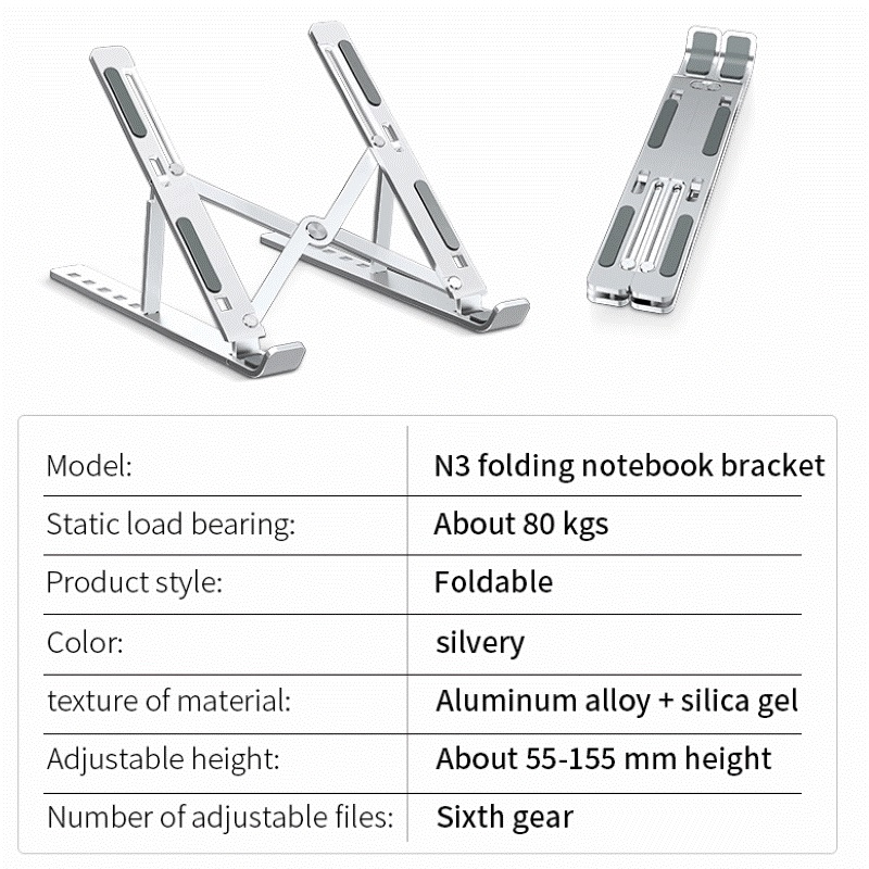 1. Material: aluminum alloy+silicone 2.Size: ≈L150×W79×H51(mm) 3.Weight: ≈176g 4.Compatible size: laptops up to 15.6-inch 5.Adjustable width: 12-26mm