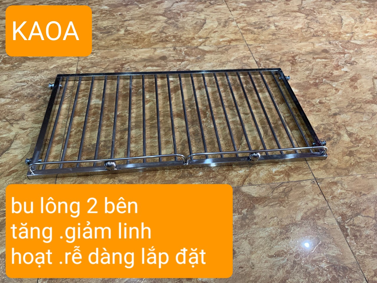 - / kích thước giá. rộng x sâu . 115 x 50 cm ( không tính bulong) 3./ sp được thiết kế thông minh với 4 bulong 2 bên rễ dàng tăng chỉnh linh hoạt theo kích thước dao động cho phép 4./ công năng . sử dụng chủ yếu xoong nồi . bát đĩa . rổ giá ác vận dụng nhà bếp vv 5./ khoảng cách nan phi 4 cm LƯU Ý BẮT BUỘC... kích thước giá 115 cm sẽ phù hợp với kích thước lắp đặt dao động từ 118 - 121 cm ƯU ĐIỂM ́ inox nhà bếp thông minh (KAOA) có thể rễ dàng tháo .lắp linh hoạt mỗi khi vệ sinh không gian phòng bếp cách lắp đặt đơn giản không cần thợ