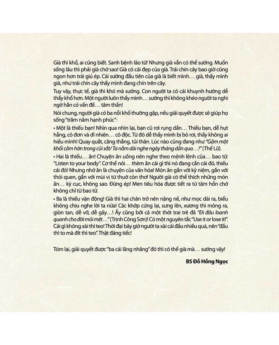 Già Sao Cho Sướng? (Tb) I. Giới Thiệu Sách Già Sao Cho Sướng? - Để Có Một Tuổi Già Hạnh Phúc (Tái bản năm 2025) Được mệnh danh là “người chữa bệnh bằng văn chương”, bác sĩ Đỗ Hồng Ngọc không chỉ là “người nhà” của Phương Nam với các ấn phẩm liên tiếp gần đây như: Thiền & Sức khoẻ, Ghi chép lang thang, Thư cho bé sơ sinh… mà còn rất thân quen với độc giả qua hàng loạt tác phẩm đã xuất bản: Gió heo may đã về, Già ơi… Chào bạn, Như ngàn thang thuốc bổ, Cành mai sân trước, Ăn vóc học hay, Thư gởi người bận rộn, Thấp thoáng lời kinh... Với tác phẩm Già Sao Cho Sướng? - Để Có Một Tuổi Già Hạnh Phúc, bác sĩ Đỗ Hồng Ngọc đã dùng cách viết dí dỏm để “chữa” thân bệnh, tâm bệnh cho các “bệnh nhân” ở tuổi xế chiều, “để có một tuổi già hạnh phúc”. Già thì khổ, ai cũng biết. Sanh lão bệnh tử. Nhưng già vẫn có thể sướng. Muốn sống lâu thì phải già chớ sao! Già có cái đẹp của già. Trái chín cây bao giờ cũng ngon hơn trái giú ép. Cái sướng đầu tiên của già là biết mình… già, thấy mình già, như trái chín cây thấy mình đang chín trên cây. Bác sĩ đã “bắt bệnh” cho người già với ba nỗi khổ thường gặp: