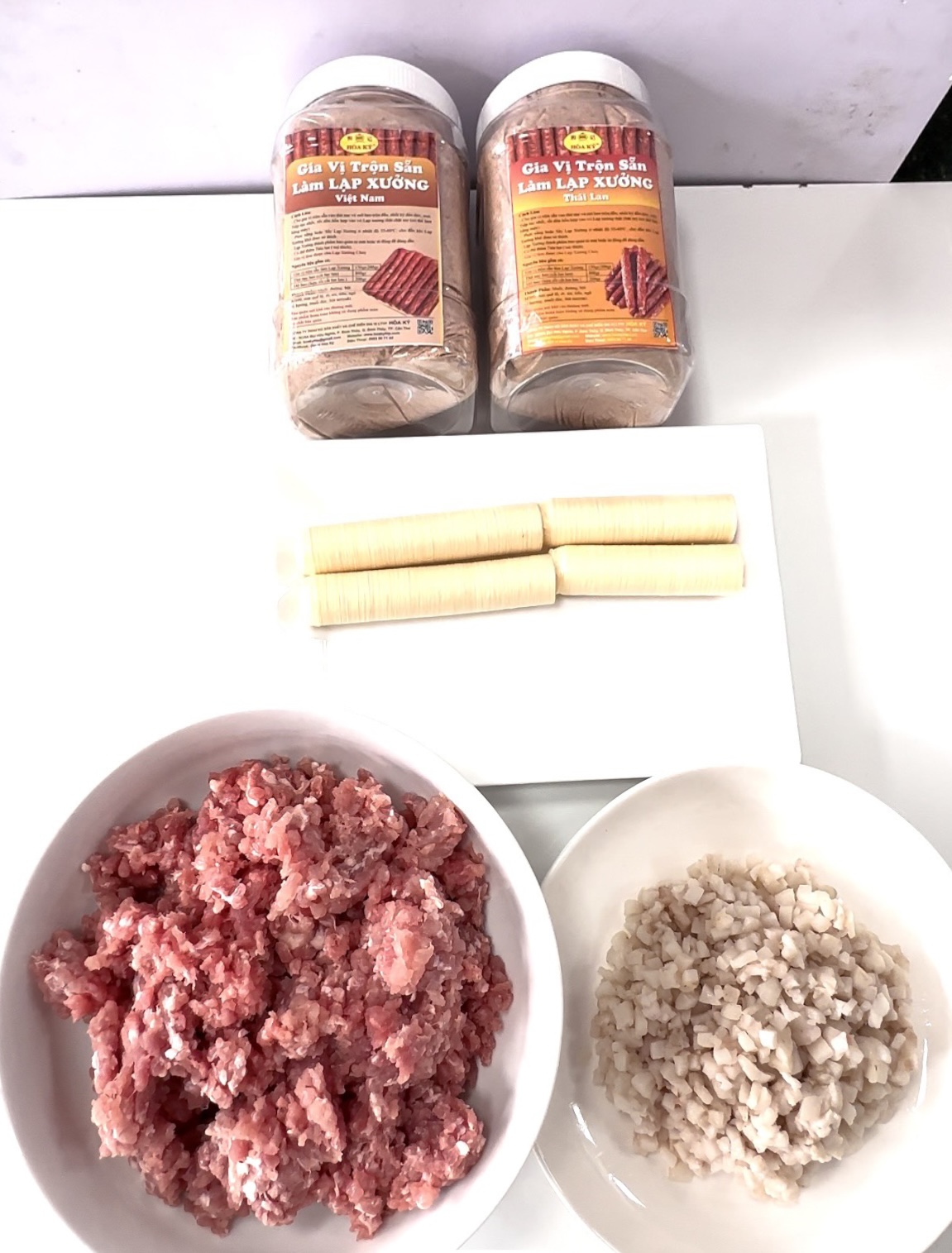 Nguyên liệu gồm có :  - Gia vị trộn sẵn làm Lạp Xưởng: 150gr- 200gr. -Thịt nạc heo ( cắt hạt lựu )    800gr -Mỡ heo (luộc rồi cắt hạt lựu )200gr Tiêu ( tuỳ thích)