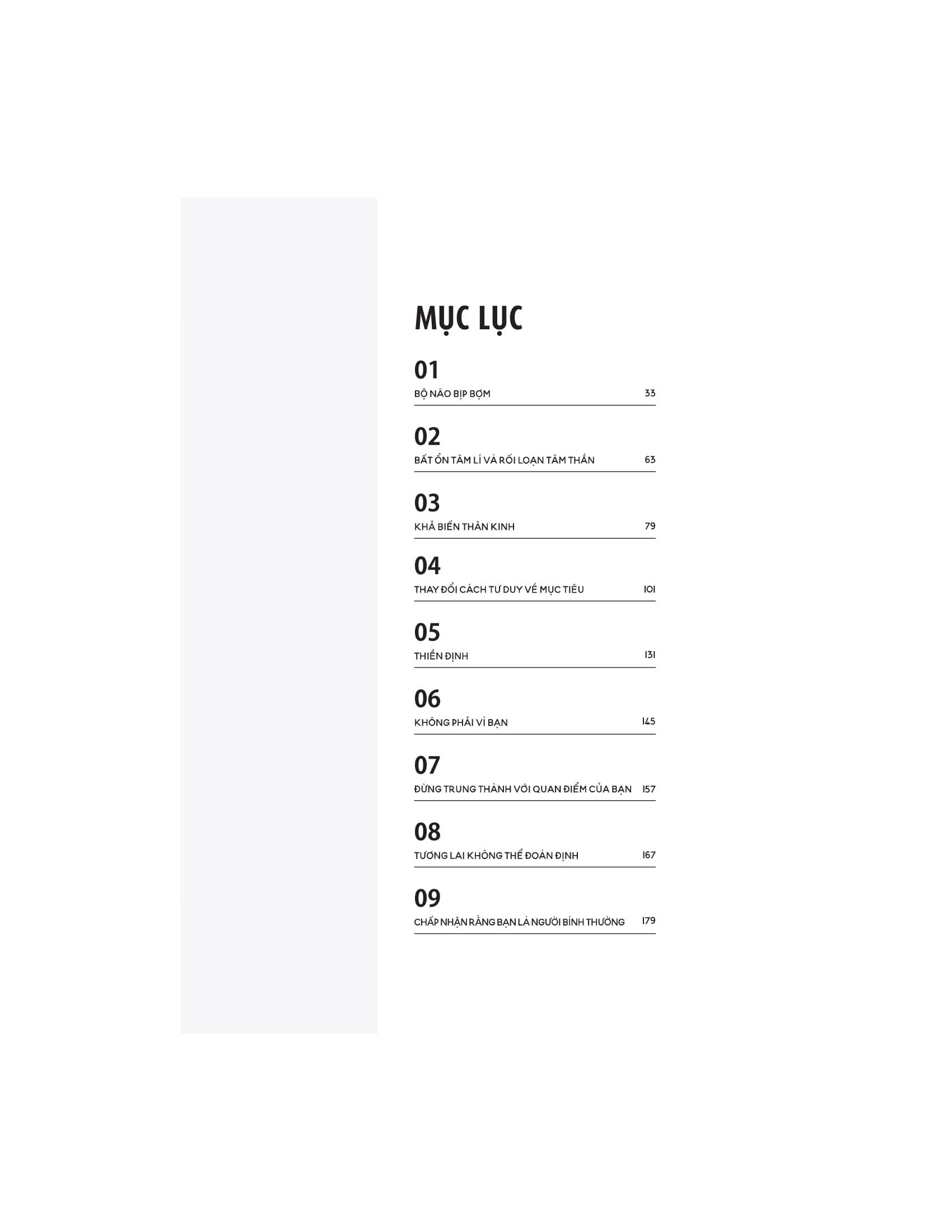 “Giải phóng bộ não khỏi tư duy độc hại” tập trung vào việc khai thác nguồn gốc gây ra nỗi sợ để chấp nhận và khắc phục chúng, giúp chúng ta kiểm soát các suy nghĩ tiêu cực, cải thiện các mối quan hệ xã hội. Từ đó, giúp người đọc trả lời hai câu hỏi: Vì sao tâm trí bạn thường tự suy diễn ra những ý nghĩ tiêu cực? Làm thế nào để chống lại những suy nghĩ tự hủy hoại bản thân đang làm hại bạn mỗi ngày?