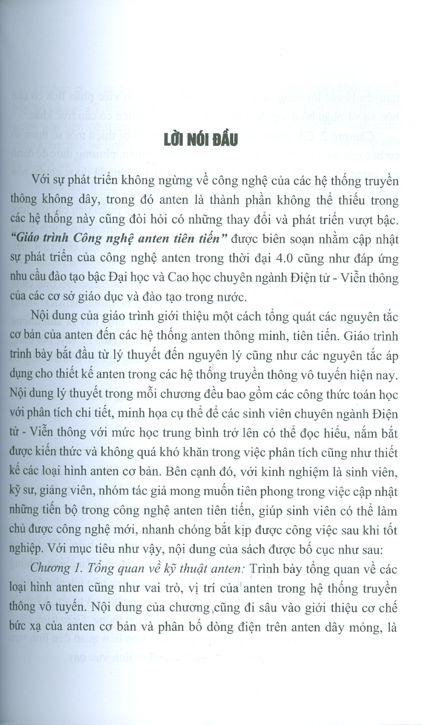 Nội dung của giáo trình giới thiệu một cách tổng quát các nguyên tắc cơ bản của anten đến các hệ thống anten thông minh, tiên tiến. Giáo trình trình bày bắt đầu từ lý thuyết đến nguyên lý cũng như các nguyên tắc áp dụng cho thiết kế anten trong các hệ thống truyền thông vô tuyến hiện nay. Nội dung lý thuyết trong mỗi chương đều bao gồm các công thức toán học với phân tích chi tiết, minh họa cụ thể để các sinh viên chuyên ngành Điện tử - Viễn thông với mức học trung bình trở lên có thể đọc hiểu, nắm bắt được kiến thức và không quá khó khăn trong việc phân tích cũng như thiết kế các loại hình anten cơ bản. Bên cạnh đó, với kinh nghiệm là sinh viên, kỹ sư, giảng viên, nhóm tác giả mong muốn tiên phong trong việc cập nhật những tiến bộ trong công nghệ anten tiên tiến, giúp sinh viên có thể làm chủ được công nghệ mới, nhanh chóng bắt kịp được công việc sau khi tốt nghiệp.