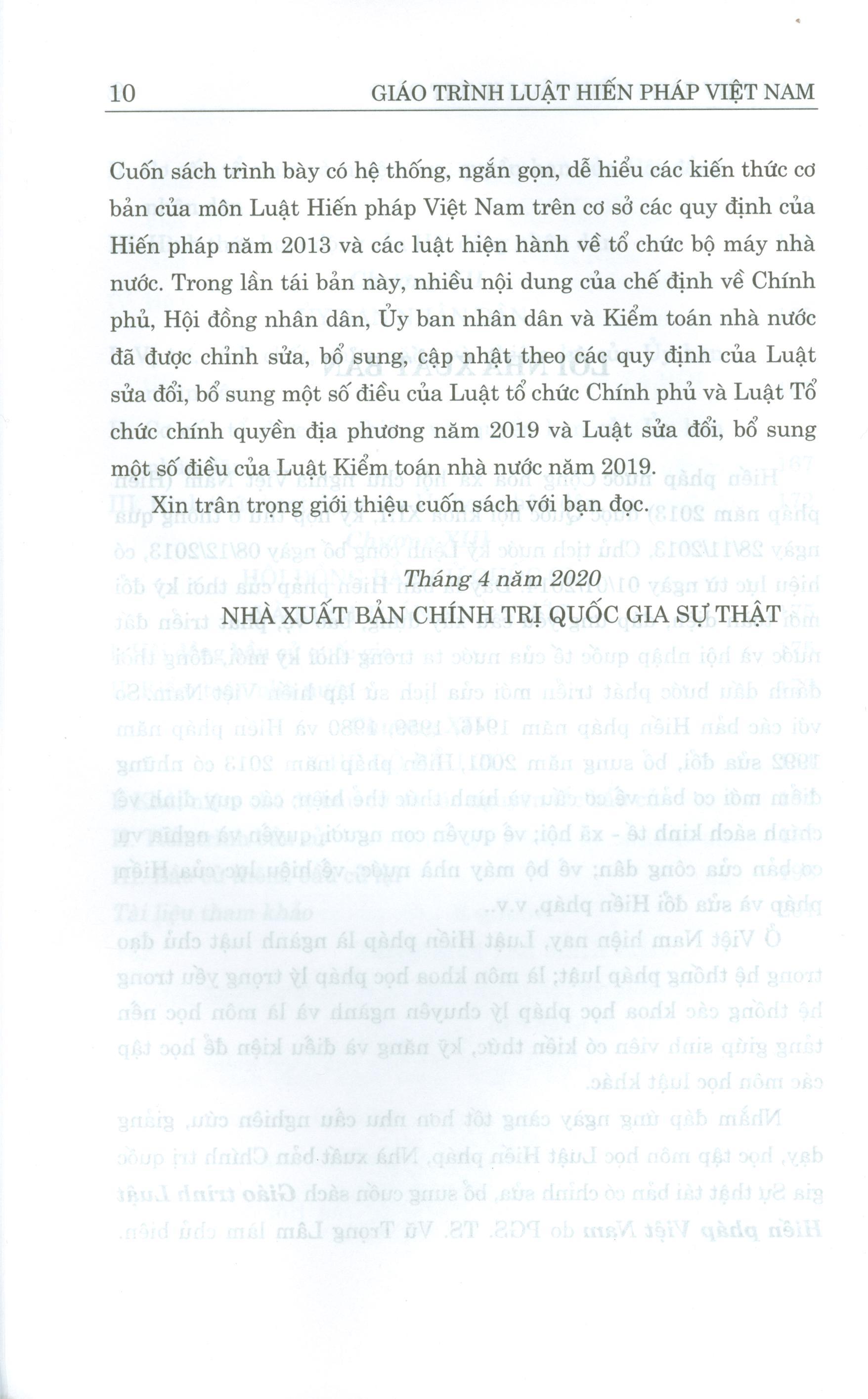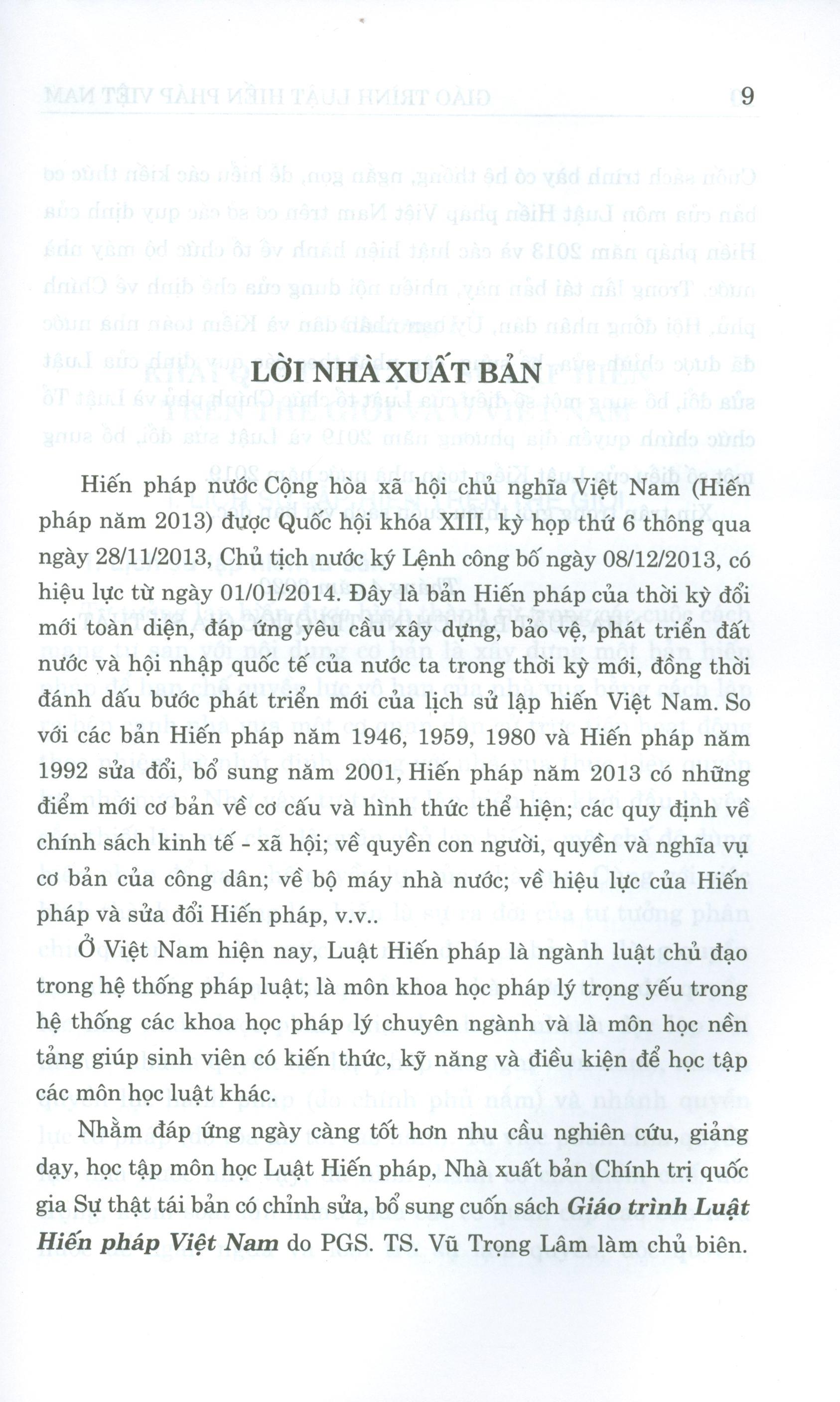 Nhằm đáp ứng ngày càng tốt hơn nhu cầu nghiên cứu, giảng dạy, học tập môn học Luật Hiến pháp, Nhà xuất bản Chính trị quốc gia Sự thật tái bản có chỉnh sửa, bổ sung cuốn sách Giáo trình Luật Hiến pháp Việt Nam do PGS. TS. Vũ Trọng Lâm làm chủ biên.