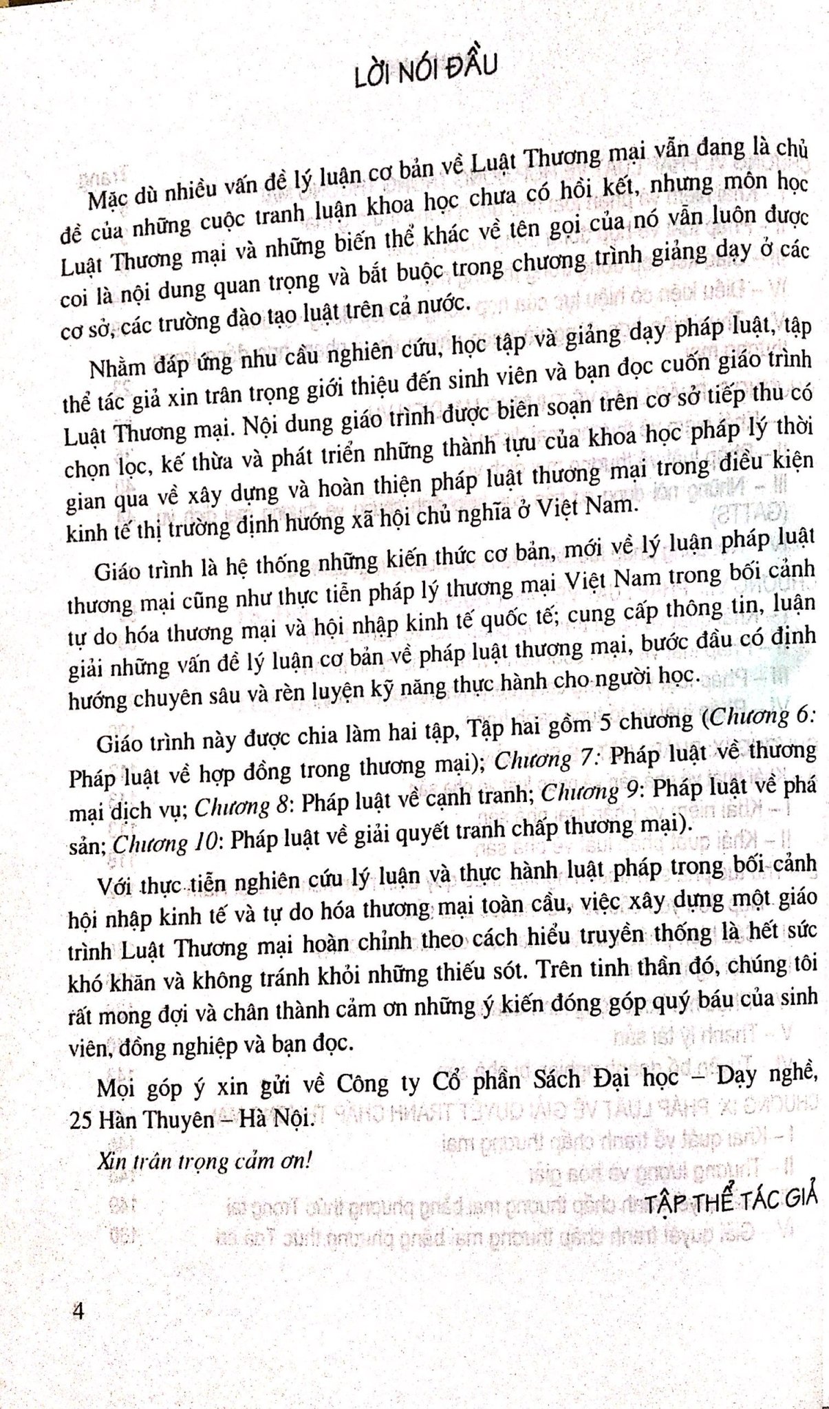 Mặc dù nhiều vấn đề để lý ance can ve L Thương mại vẫn đang là vẫn luôn được đề của những cuộc tranh luận khoa học chưa có hồi kết, nhưng môn học Luật Thương mại và những biến thể khác về tên gọi coi là nội dung quan trọng và bắt buộc trong giảng dạy ở các cơ sở, các trường đào tạo luật trên cả nước. Ban can ho " của nó Nhằm đáp ứng nhu cầu nghiên cứu, học tập và giảng dạy pháp luật, tập the ta giả xin trân trọng giới thiệu đến sinh viên và bạn đọc cuốn giáo trình Luật Thương mại. Nội dung giáo trình được biên soạn trên cơ sở tiếp thu có chọn lọc, kế thừa và phát triển những thành tựu của khoa học pháp lý thời gian qua về xây dựng và hoàn thiện pháp luật thương mại trong điều kiện kinh tế thị trường định hướng xã hội chủ nghĩa ra ở Việt Nam. 1 ph Giáo trình là hệ thống những kiến thức cơ bản, mới về lý luận pháp luật thương mại cũng như thực tiễn pháp lý thương mại Việt Nam trong bối cảnh tự do hóa thương mại và hội nhập kinh tế quốc tế; cung cấp thông tin, luận giải những vấn đề lý luận cơ bản về pháp luật thương mại, bước đầu có định hướng chuyên sâu và rèn luyện kỹ năng thực hành cho người học. hương Giáo trình này được chia làm hai tập, Tập hai gồm 5 chương (Chương 6: Pháp luật về hợp đồng trong thương mại); Chương 7: Pháp luật về thương mại dịch vụ; Chương 8: Pháp luật về cạnh tranh; Chương 9: Pháp luật về phá sản; Chương 10: Pháp luật về giải quyết tranh chấp thương mại). Với thực tiễn nghiên cứu lý luận và thực hành luật pháp trong bối cảnh hội nhập kinh tế và tự do hóa thương mại toàn cầu, việc xây dựng một giáo trình Luật Thương mại hoàn chỉnh theo cách hiểu truyền thống là hết sức khó khăn và không tránh khỏi những thiếu sót. Trên tinh thần đó, chúng tôi rất mong đợi và chân thành cảm ơn những ý kiến đóng góp quý báu của sinh viên, đồng nghiệp và bạn đọc
