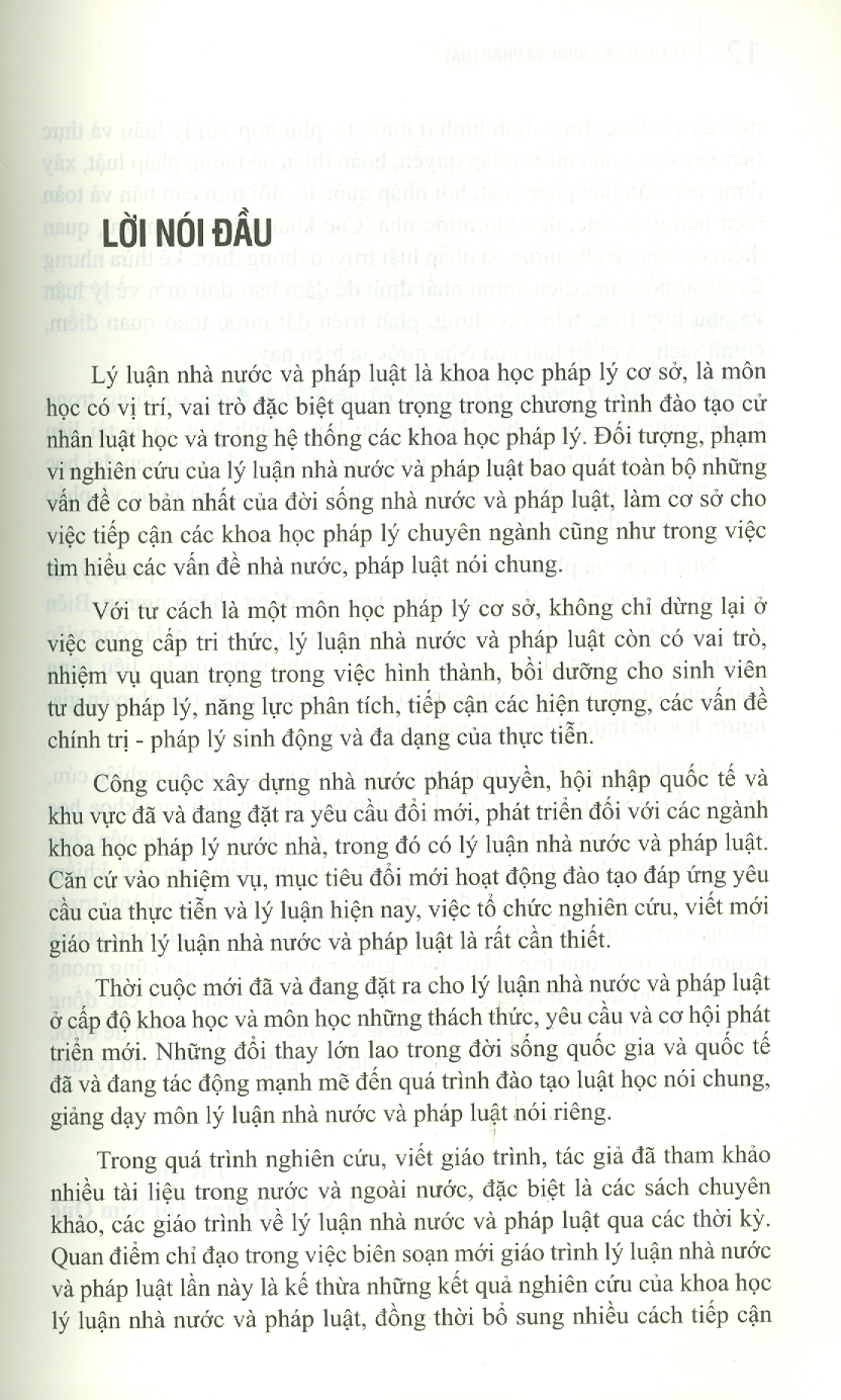 Lý luận nhà nước và pháp luật là khoa học pháp lý cơ sở, là môn học có vị trí, vai trò đặc biệt quan trọng trong đào tạo cử nhân luật học và trong hệ thống các khoa học pháp lý. Đối tượng, phạm vi nghiên cứu của lý luận nhà nước và pháp luật bao quát toàn bộ những vấn đề cơ bản nhất của đời sống nhà nước và pháp luật, làm cơ sở cho việc tiếp cận các khoa học pháp lý chuyên ngành cũng như trong việc tìm hiểu các vấn đề nhà nước, pháp luật nói chung. Căn cứ vào nhiệm vụ, mục tiêu đổi mới hoạt động đào tạo đáp ứng yêu cầu của thực tiễn và lý luận hiện nay, việc tổ chức nghiên cứu, viết mới giáo trình lý luận nhà nước và pháp luật là rất cần thiết.
