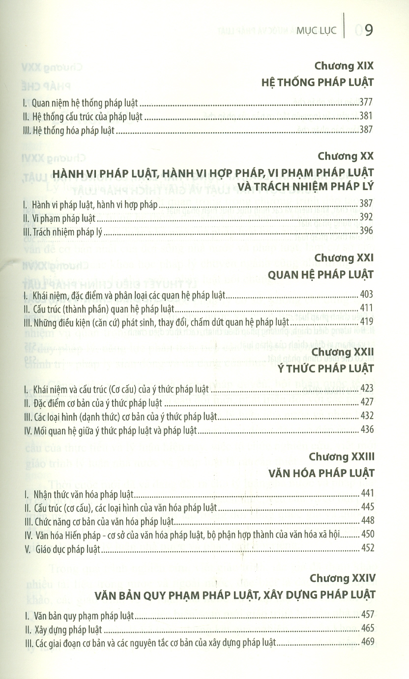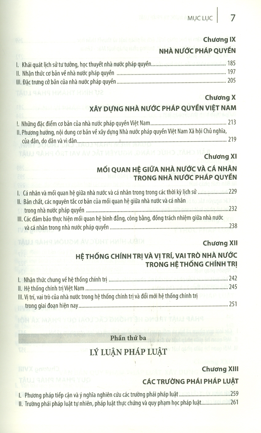 Cuốn sách có dung lượng 540 trang được chia làm 27 chương, hệ thống các vấn đề được trình bày chi tiết và sáng rõ; các khái niệm, phạm trù, quan điểm cơ bản về nhà nước và pháp luật truyền thống được kế thừa nhưng đã có sự điều chỉnh, bổ sung nhất định để đảm bảo tính mới về lý luận và phù hợp thực tiễn xây dựng, phát triển đất nước theo quan điểm, chính sách và pháp luật Nhà nước Việt Nam hiện nay; giúp bồi dưỡng cho sinh viên, học viên tư duy pháp lý, năng lực phân tích, tiếp cận các hiện tượng, vấn đề chính trị - pháp lý sinh động và đa dạng của thực tiễn.