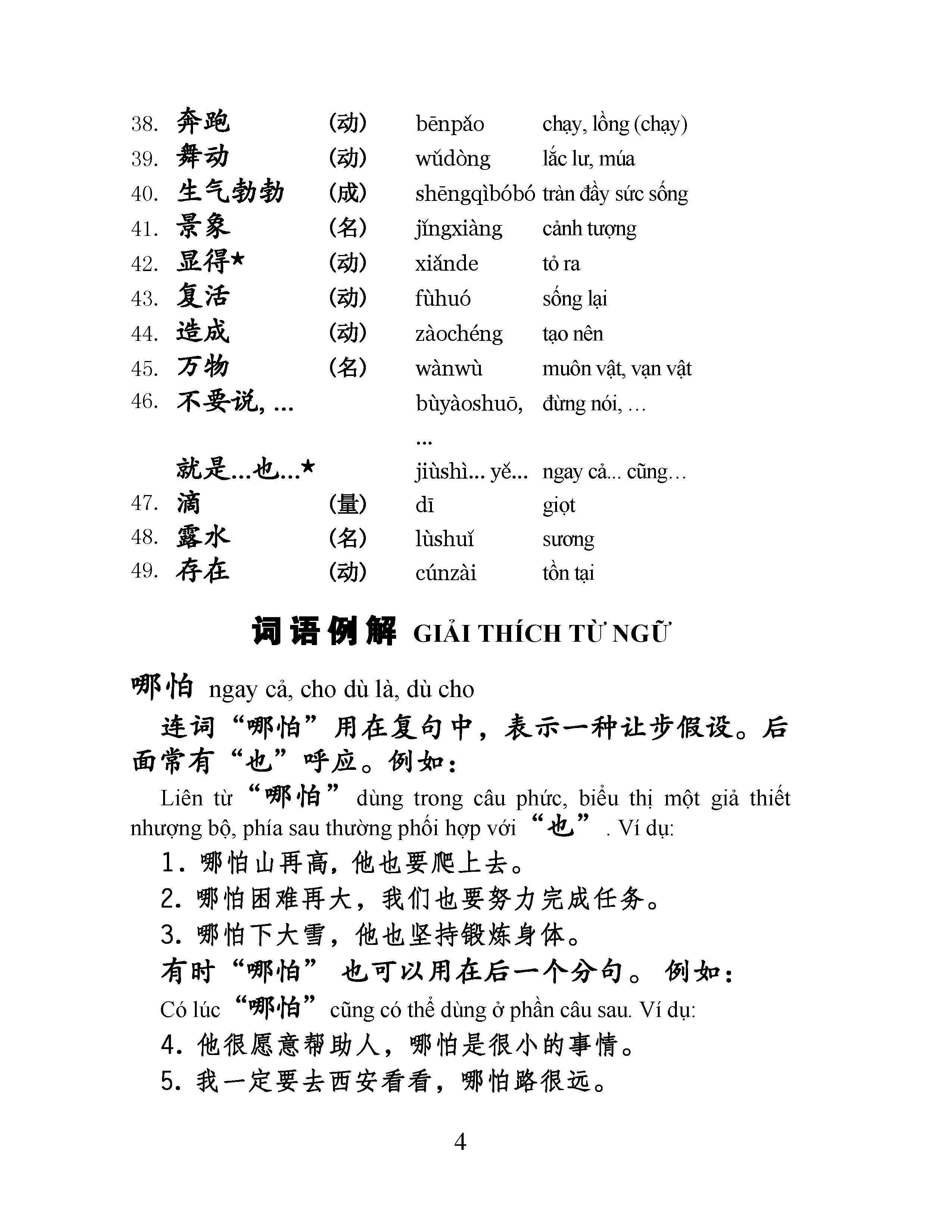 Ngoài ra, để giúp người học củng cố, bổ sung và hệ thống lại các nội dung ngữ pháp đã học trong chương trình sơ trung cấp, khi biên dịch tài liệu này, chúng tôi soạn thêm phần “Ôn tập ngữ pháp” theo hình thức tiểu kết sau mỗi bài. Để người học có thể đối chiếu bài làm, bài dịch của mình, chúng tôi có bổ sung thêm ở cuối sách phần “Đáp án bài tập” và “Bản dịch các bài đọc”. Sách còn có “Bảng từ vựng”, “Bảng danh từ riêng”, “Bảng từ ngữ được giải thích” giúp người học thuận lợi hơn trong việc tra cứu.