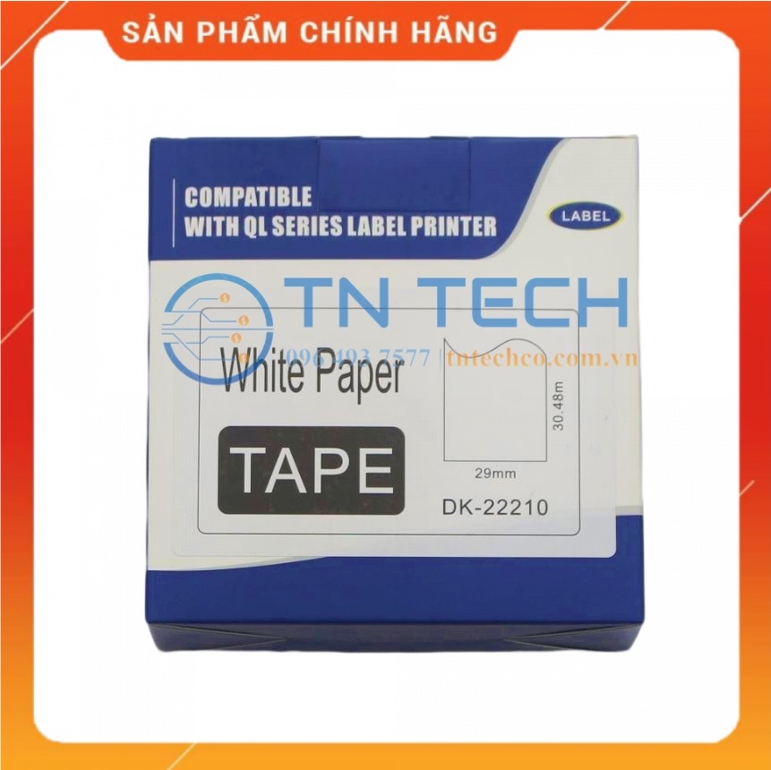- Mã hàng: DK-22210 - Màu sắc: Chữ đen, nền trắng - Loại nhãn: nhãn giấy - Kích thước: 29mm x 30.48m - Tương thích: với các loại máy in Brother QL Nhãn in Brother DK-22210