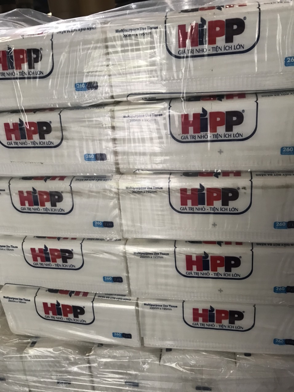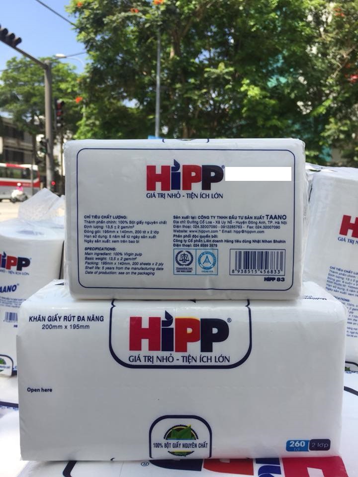 KHĂN GIẤY RÚT ĐA NĂNG HIPP 260 tờ 2 lớp ( kích thước 200mm x 195mm) Ưu điểm: Cực dai, cực mềm Không bị mủn khi dính nước Trọng lượng: 260gr An toàn với da