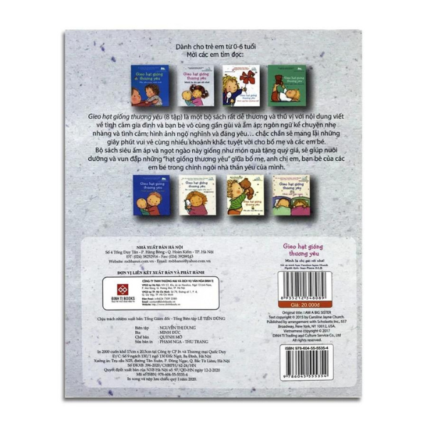 Gieo hạt giống thương yêu (8 tập) là một bộ sách rất dễ thương và thú vị với nội dung viết về tình cảm gia đình và bạn bè vô cùng gần gũi và ấm áp, ngôn ngữ kể chuyện nhẹ nhàng và tình cảm, hình ảnh ngộ nghĩnh và đáng yêu... chắc chắn sẽ mang lại những giây phút vui vẻ cùng nhiều khoảnh khắc tuyệt vời cho bố mẹ và các em bé.