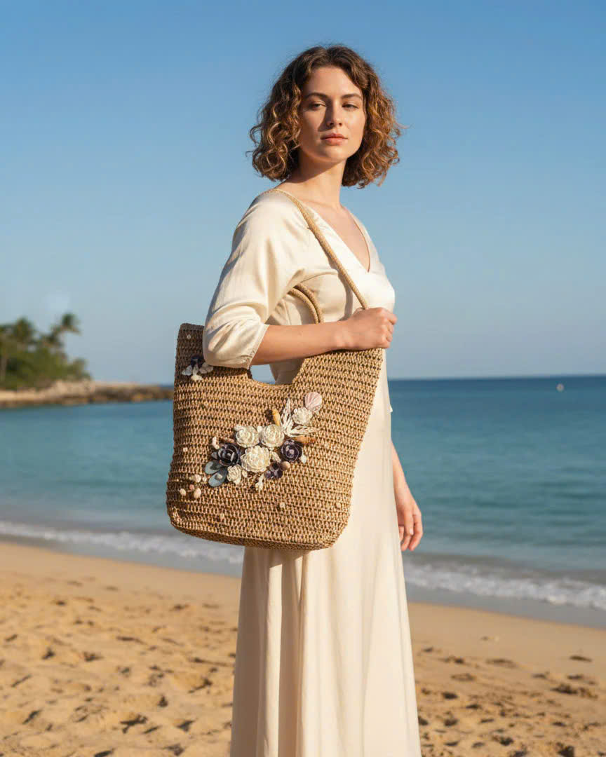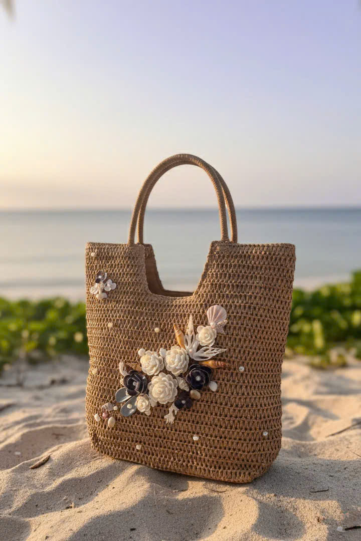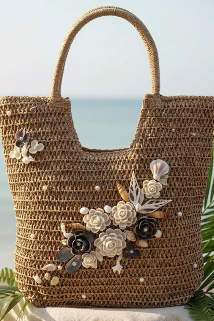 ✨Giỏ Cói Giấy Mềm Dáng Tote Gắn Vỏ Sò, Giỏ Cói Tote Lan Châu ACC142