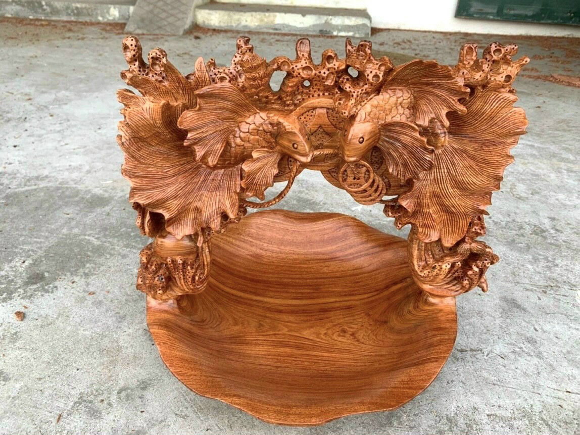 ✨Giỏ đựng hoa quả khắc cặp cá vàng bằng gỗ hương đá kt 35×43×37cm