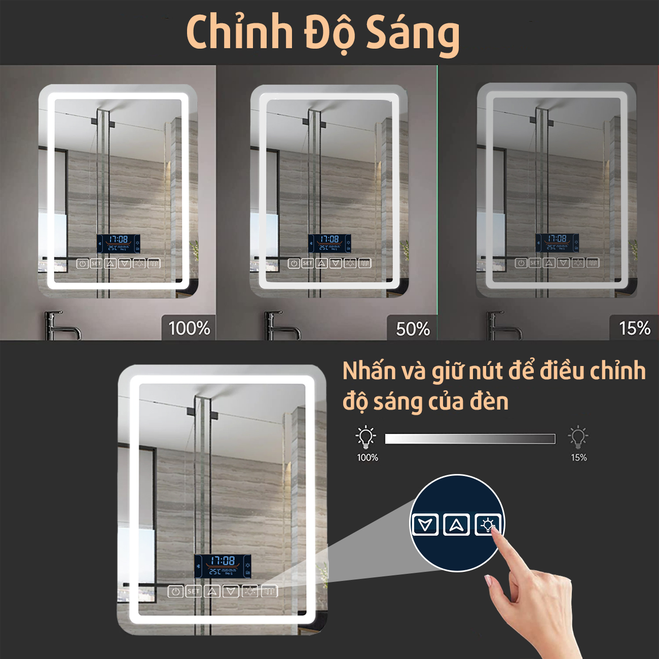 - Nhấn giữ nút để điều chỉnh mức độ sáng của đèn