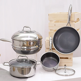 Bộ gồm 4 chiếc: Nồi sâu cán dài 16c, nồi 22cm,chảo chiên 24cm, chảo sâu lòng 28cm, kèm xửng 28cm.