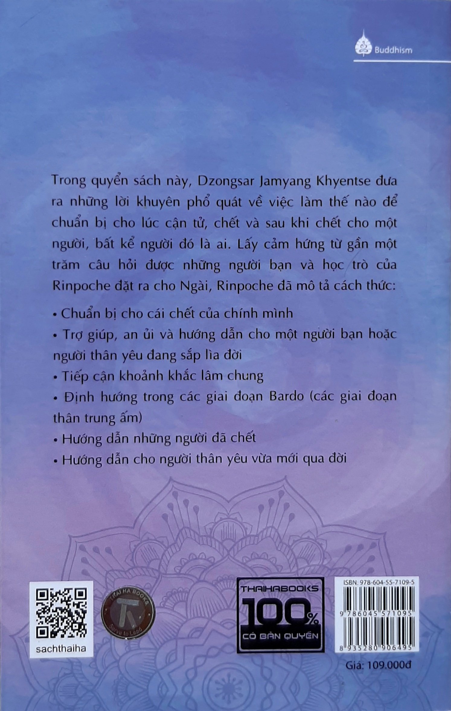 Trong quyển sách “Hành trình sinh tử”, Dzongsar Khyentse Rinpoche đưa ra những lời khuyên phổ quát về việc làm thế nào để chuẩn bị cho lúc cận tử, chết và sau khi chết cho một người, bất kể người đó là ai. Lấy cảm hứng từ gần một trăm câu hỏi được những người bạn và học trò của Rinpoche đặt ra cho Ngài, Rinpoche đã mô tả cách thức: chuẩn bị cho cái chết của chính mình; trợ giúp, an ủi và hướng dẫn cho một người bạn hoặc người thân yêu đang sắp lìa đời; tiếp cận khoảnh khắc lâm chung; định hướng trong các giai đoạn Bardo (các giai đoạn thân trung ấm); hướng dẫn những người đã chết hướng dẫn cho người thân yêu vừa mới qua đời. “Những chỉ dẫn dành cho Phật tử sẽ là giống nhau trong suốt quá trình hấp hối, tại thời điểm chết và sau khi chết, cho dù đó là một người cao tuổi ra đi bình an trong giấc ngủ hay một người đột tử vì những nguyên nhân và điều kiện đưa đến cái chết đã chín muồi. Thông tin đối với quá trình hấp hối, chết và những gì xảy ra sau khi chết được đề cập trong quyển sách này là sự trình bày rất đơn giản về một truyền thống cụ thể và cổ xưa trong số những giáo lý của đạo Phật, đã được truyền giữ qua một mạng mạch lâu dài bởi những nhà tư tưởng Phật giáo lỗi lạc, mà mỗi vị trong số họ đã dành những chặng đường khá lâu để nghiên cứu về cái chết và tiến trình chết chi tiết đến từng phút, và ở mọi góc độ. Những lời khuyên của họ có thể đặc biệt hữu dụng đối với Phật tử hoặc những ai được thu hút bởi giáo lý của Đức Phật, nhưng cũng phù hợp ở mức độ tương đương đối với bất kỳ ai – bởi vì cuối cùng, ai rồi cũng sẽ chết. Như vậy, dù cho có là Phật tử hay không, nếu bạn là người có tâm trí rộng mở và tò mò, hoặc thường suy tư về cái chết của chính mình hay của một người thân yêu nào đó, thì có thể bạn sẽ tìm thấy được điều hữu ích tương tự trong những trang sách này. Mọi việc xảy ra trong khi chúng ta còn sống hay chết hoàn toàn phụ thuộc vào những nguyên nhân và điều kiện mà chúng ta đã tích tập. Vì mỗi người sẽ kinh nghiệm cái chết vật lý và sự tan rã của thân tứ đại vô cùng khác nhau, nên hành trình của mỗi người khi xuyên qua những giai đoạn Bardo cũng khác biệt. Như vậy, bất kỳ một mô tả nào hay tất cả sự mô tả về quá trình hấp hối, chết và trạng thái Bardo chỉ là những nội dung được khái quát hóa. Tuy nhiên, khi tiến trình chết bắt đầu xảy ra, việc có những ý tưởng phỏng đoán về những gì đang diễn biến không chỉ góp phần lớn vào việc xua tan những nỗi lo lắng tồi tệ nhất, mà còn giúp chúng ta đối mặt với cái chết bằng tâm thái nhẹ nhàng và thanh thản. Mặc dù những truyền thống Phật giáo xác tín nhất cũng đưa ra các lời khuyên tương tự về mặt bản chất, nhưng mỗi truyền thống đã phát triển dựa trên loại ngôn ngữ và thuật ngữ riêng nên một số chi tiết có thể được diễn đạt khác nhau; xin đừng hiểu lầm và cho rằng những điểm khác biệt này là mâu thuẫn.” - Dzongsar Khyentse Rinpoche