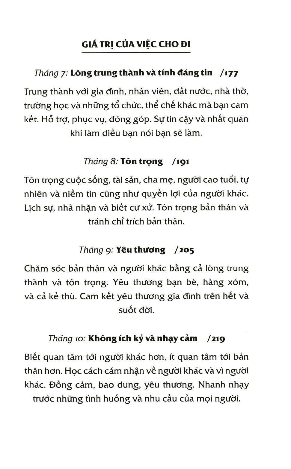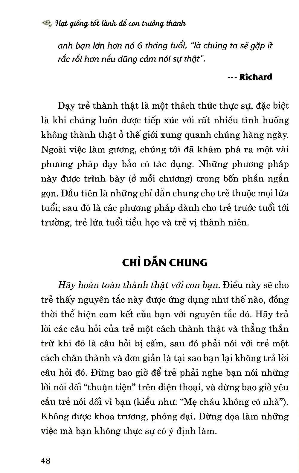 Cuốn sách nỗ lực giúp các bậc cha mẹ xác định hệ thống giá trị của mình và lựa chọn những “hạt giống tốt lành” nhất để gieo lên “mảnh đất” mới bồi trong lòng con cái. Hệ thống giá trị của bạn có thể rất giống - hoặc cũng có thể rất khác - với hệ thống giá trị trong cuốn sách, vì vốn dĩ trên đời này chẳng hề tồn tại hai hạt giống giống nhau hoàn toàn. Nhưng điều đó không thành vấn đề, bởi điều quan trọng nhất là bạn phải không ngừng phát triển nhóm giá trị riêng của gia đình mình và dạy lại những giá trị này cho con cái. Gia đình sẽ không bao giờ có thể bị thay thế bởi một thể chế, nơi mà những giá trị cơ bản được dạy và được học, giống như việc một hạt giống cây lê, lớn lên dù nó có nhiều – ít hay thậm chí chẳng có quả lê nào thì nó vẫn mãi mãi là cây lê, không khác được.