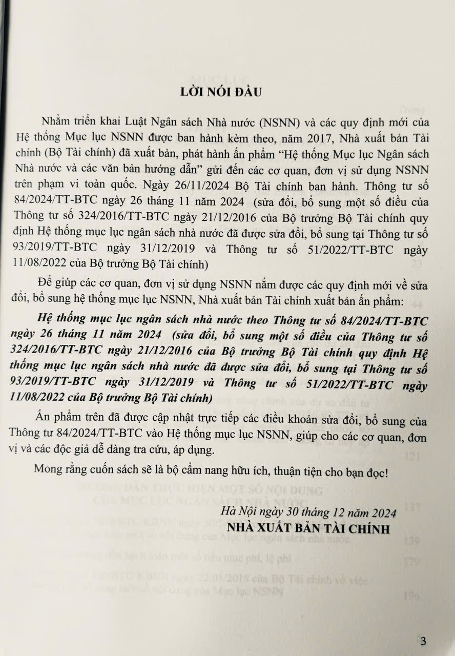 Sách - Hệ Thống Mục Lục Ngân Sách Nhà Nước (Đã được sửa đổi theo thông tư số 84/2024/TT-BTC ngày 26 tháng 11 năm 2024) Tác giả: Bộ tài chính Nhà xuất bản: Tài Chính